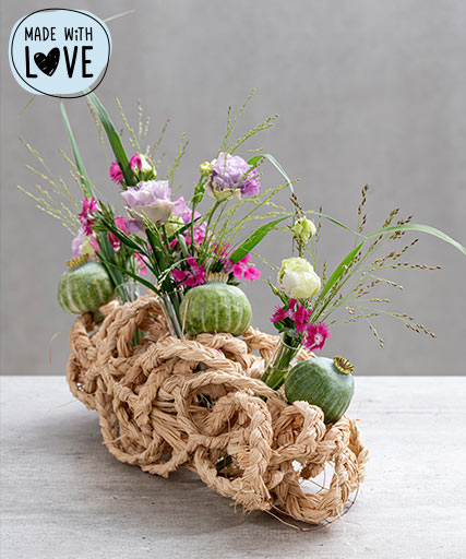Bast ist so vielseitig anwendbar. Ob zum Verpacken eines Geschenks oder zum Abbinden eines Straußes, er findet im Alltag vielfältige Verwendung. Diesmal ist er nicht nur ein kleines Dekorationselement, sondern der Mittelpunkt. Eine Tischdekoration, die sich perfekt für die letzten warmen Abende eignet und ideal für Feiern mit Freunden und der Familie im Garten ist.