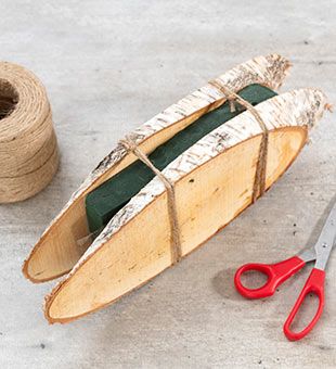 1. Als erstes weichen Sie Ihren Steckschaum ein. Schneiden Sie ihn passend auf die Holzscheiben zu und wickeln sie ihn in Folie, so dass kein Wasser austreten kann.