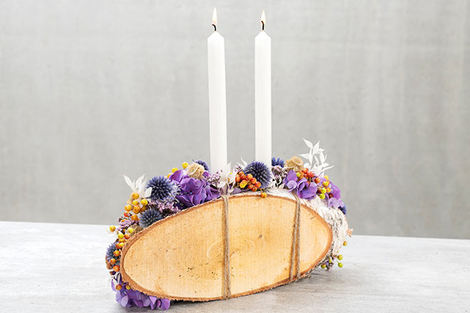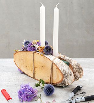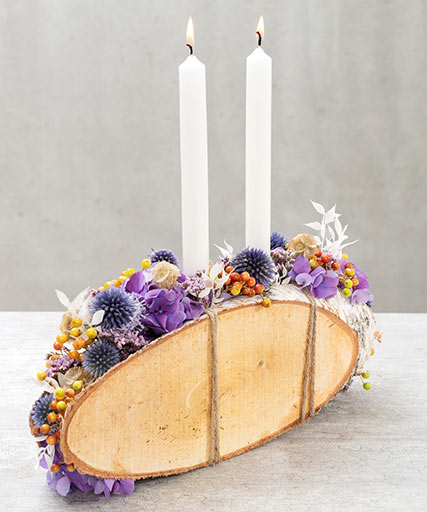 Der Herbst ist die Zeit der Gemütlichkeit. Dieser Kerzenständer besteht aus Birkenscheiben, der mit herbstlichen Blüten gestaltet ist. Durch die natürlichen Materialien passt er sich an jede Einrichtung Ihrer Kunden an und ist individuell gestaltbar.