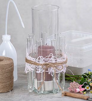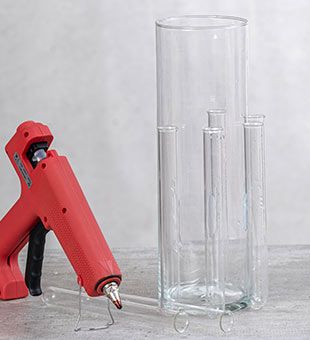 3. Befestigen Sie ebenfalls mit Hilfe von Heißkleber einzelne Reagenzgläser an einer großen Glasvase, in die im nächsten Schritt eine Kerze gestellt werden kann.