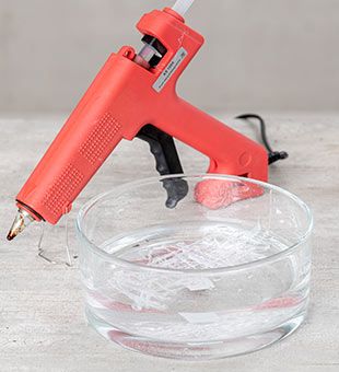 1. Lassen Sie Heißkleber in kaltes Wasser fließen und stellen Sie auf diese Weise eine Art Bordüre her. Sie können dafür kurze Stücke produzieren, die Sie anschließend zur gewünschten Länge zusammenkleben.