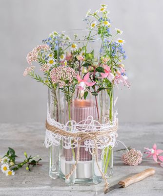 4. Jetzt legen Sie zur Zierde die Bordüre über die Röhrchen und umwickeln zur Stabilisierung das Ganze mit einem Schleifenband. Befüllen Sie zu guter Letzt die Reagenzgläser mit Wasser und sommerlichen Blüten und Blättern Ihrer Wahl.