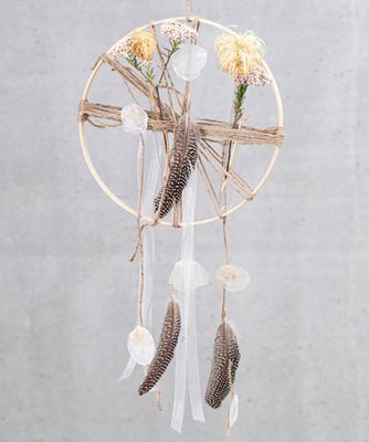 Ein Traumfänger kann als dekoratives Element, in vielen verschiedenen Umgebungen Verwendung finden - sowohl im Innen- als auch im Außenbereich. Er ist eine abwechslungsreiche Alternative zum klassischen Flower- Loop und besteht traditionell aus einem kreisförmigen Rahmen, der mit einer gewebten Netzstruktur versehen ist. Er soll nach indianischem Glauben schlechte Träume einfangen und positive Träume hindurchlassen.