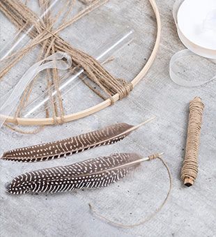 3. An diesem Gerüst befestigen Sie zunächst alle Materialien ihrer Wahl, wie zum Beispiel Schnüre, Bänder und Federn, die Sie in unterschiedlichen Längen anbringen können.