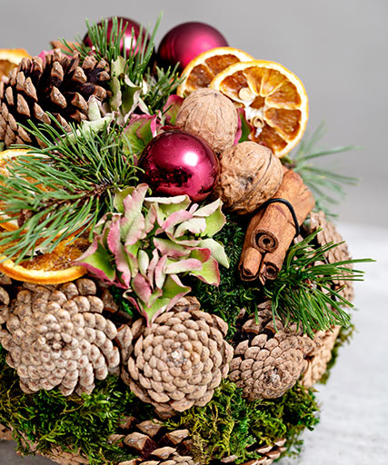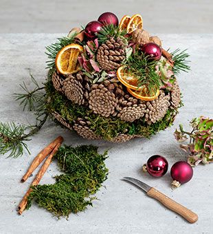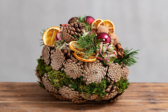 4. Mit einer vielzahl von Materialien können Sie die Schale nun weihnachtlich gestalten. Ihrer Kreativität sind keine Grenzen gesetzt. Viel Spaß beim Nachmachen.