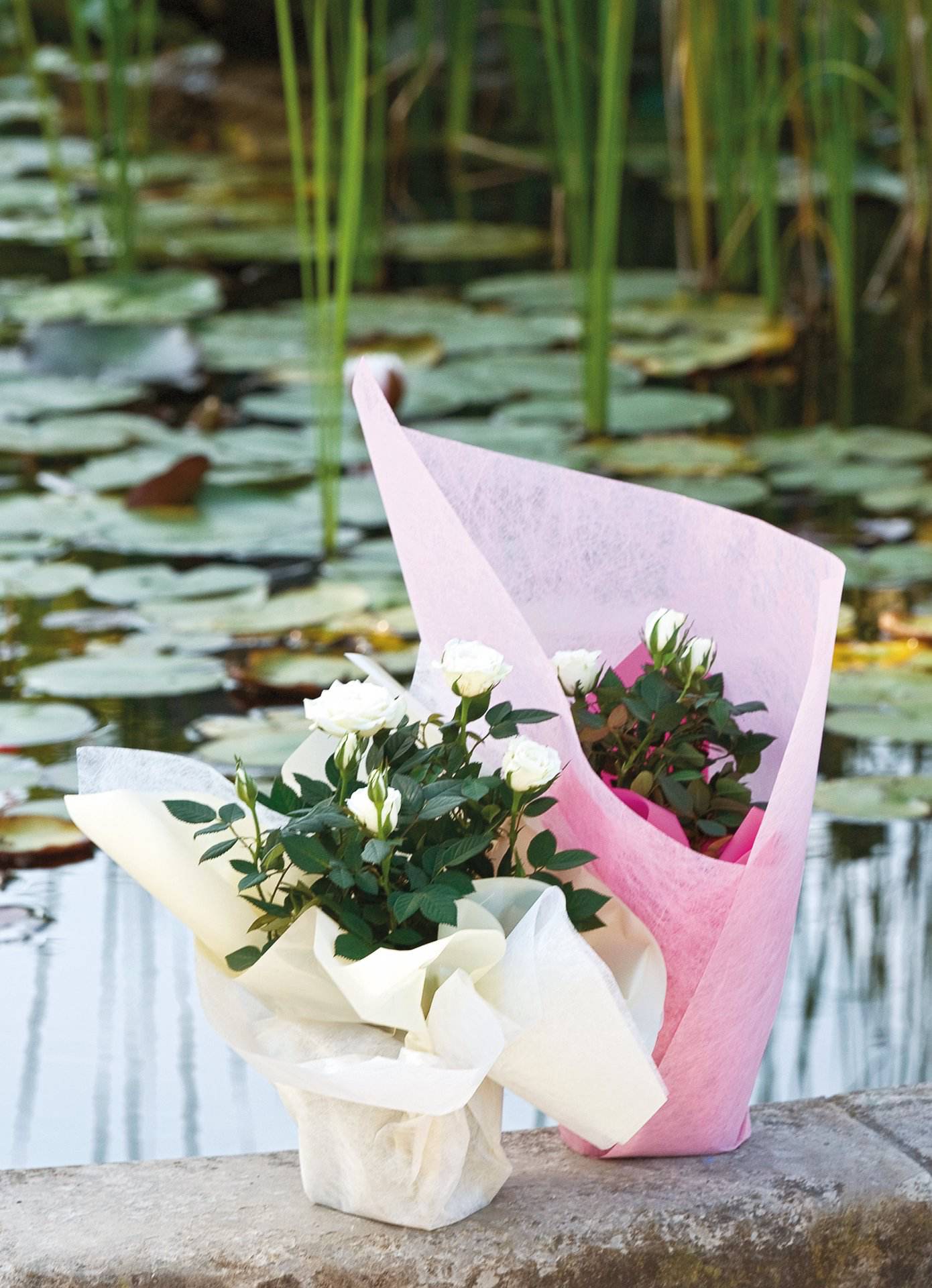 Quadratische, 2-teilige Blumenmanschette in 2 Größen. Je 25 Stück aus Folie und 25 Stück aus Vliesstoff.