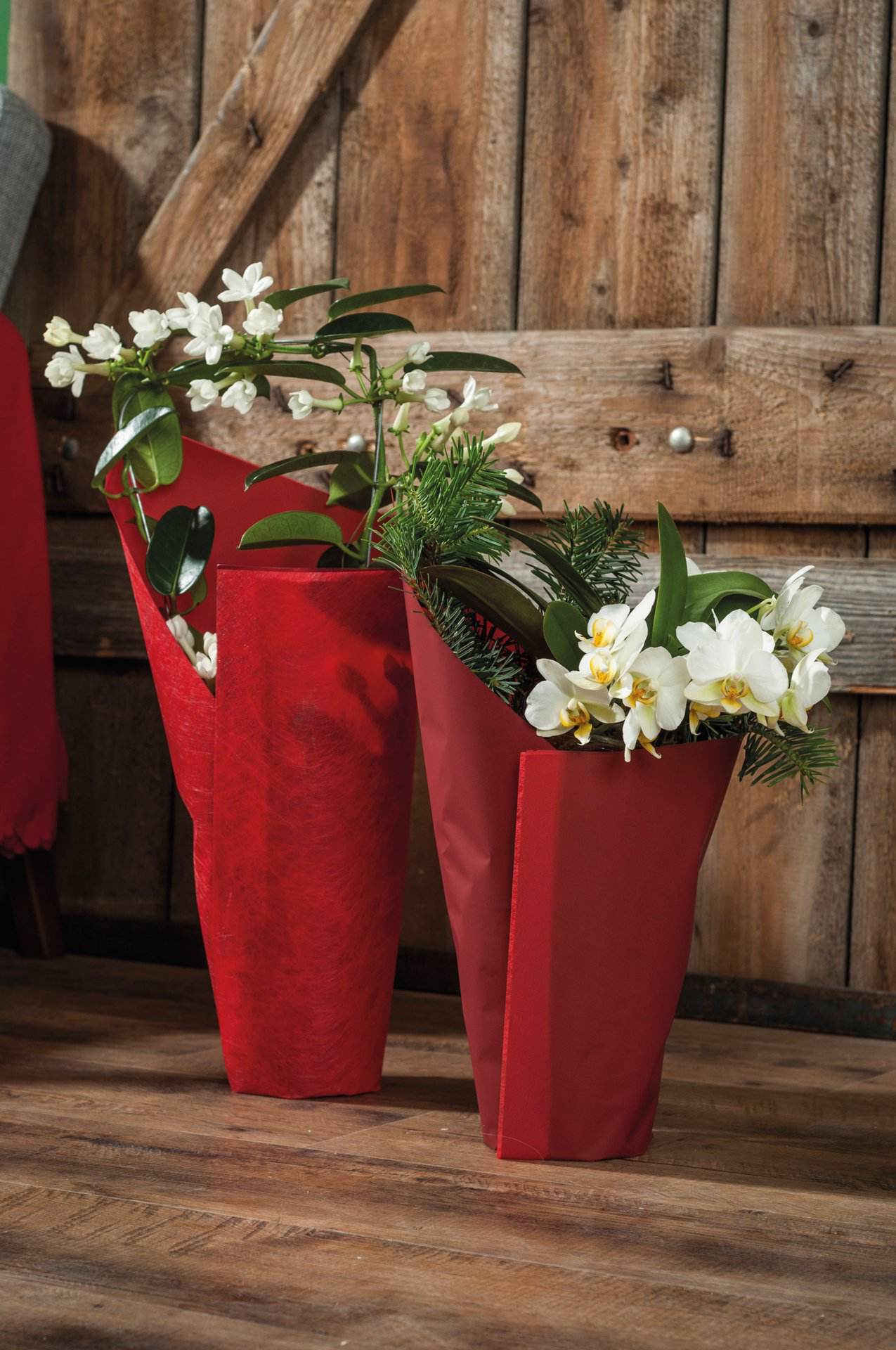 Quadratische, 2-teilige Blumenmanschette in 2 Größen. Je 25 Stück aus Folie und 25 Stück aus Vliesstoff.