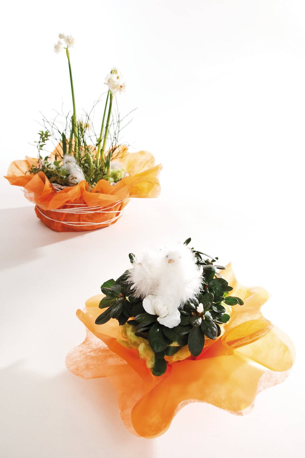 Runde, 2-teilige Blumenmanschette in 2 Größen. Je 25 Stück aus Folie und 25 Stück aus Vliesstoff.