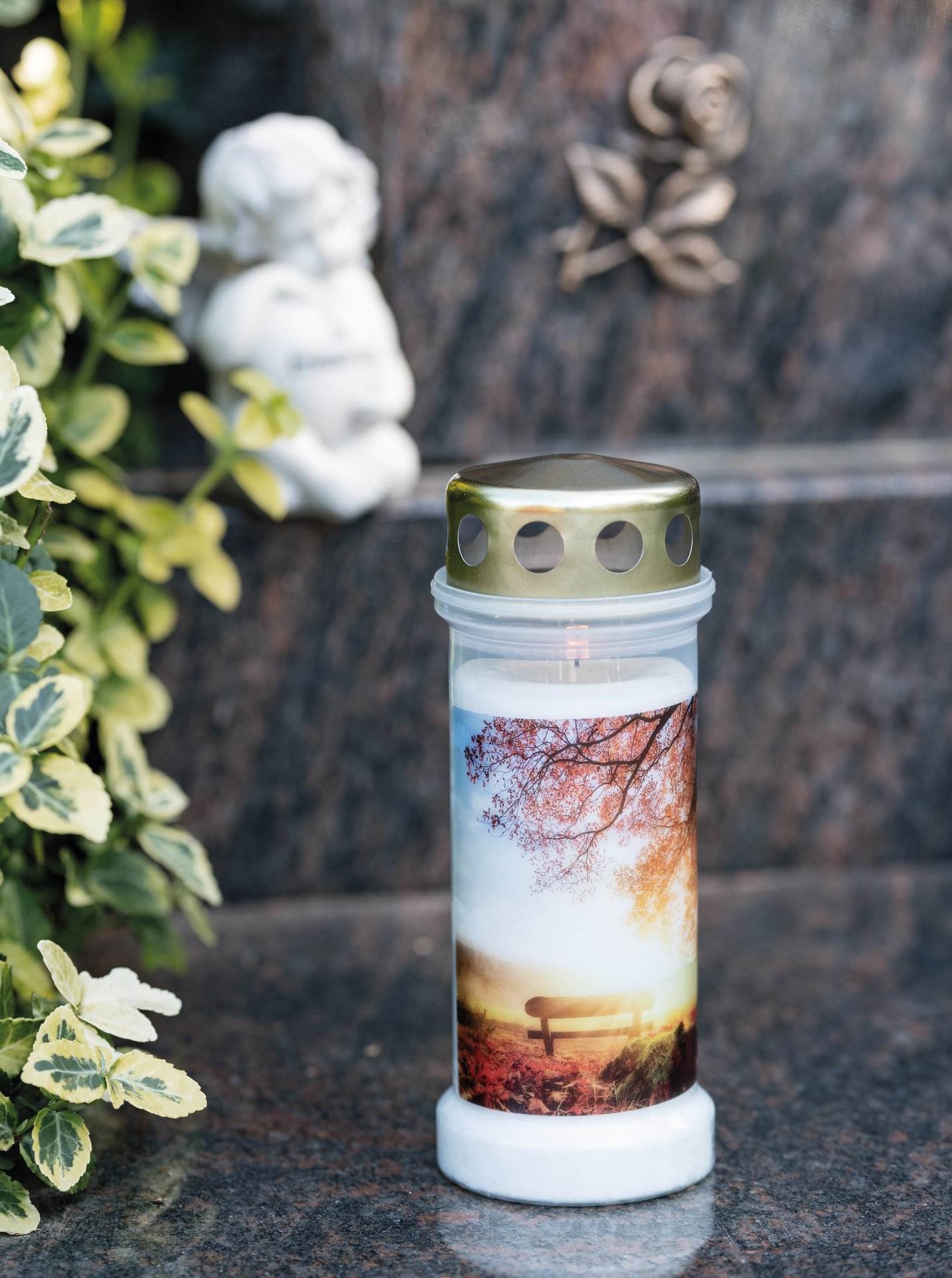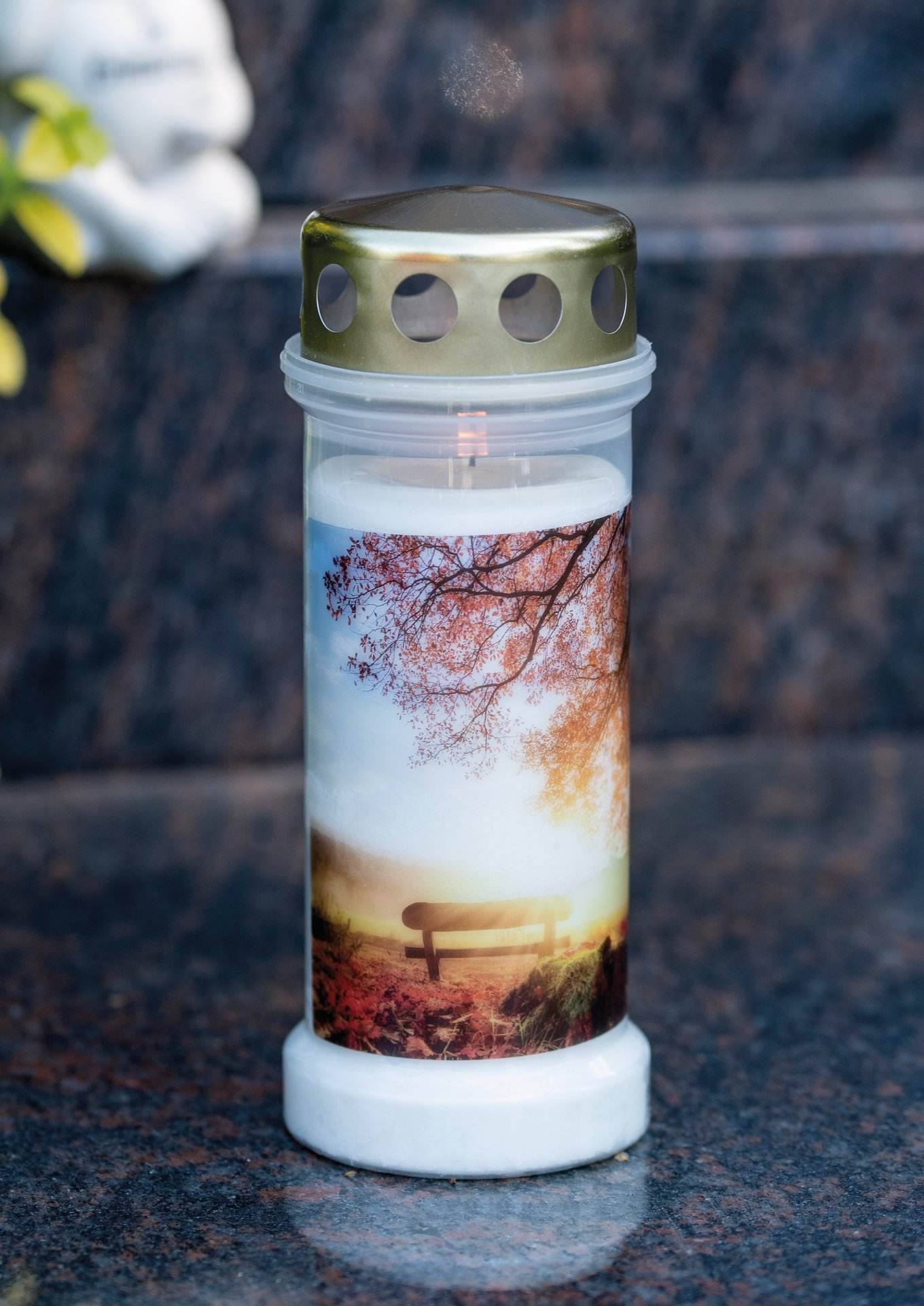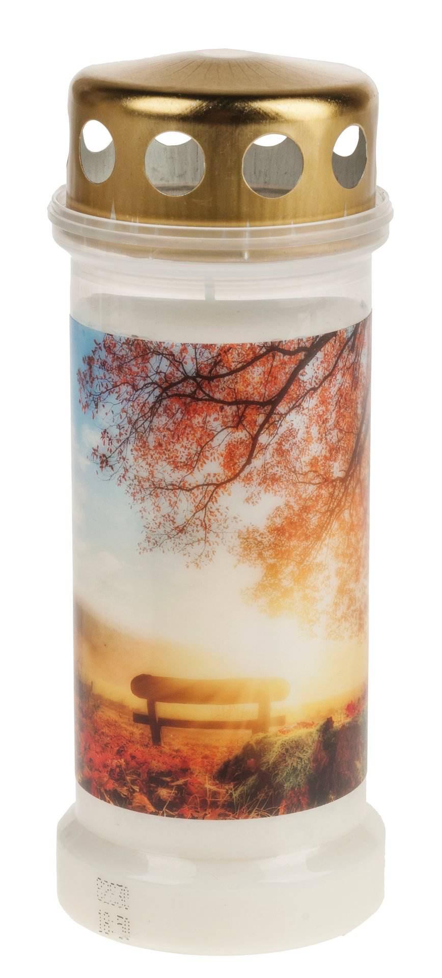 Gefülltes, weißes Grablicht mit goldenem Deckel und farbigem Trauermotiv. Brenndauer: ca. 70 Stunden.