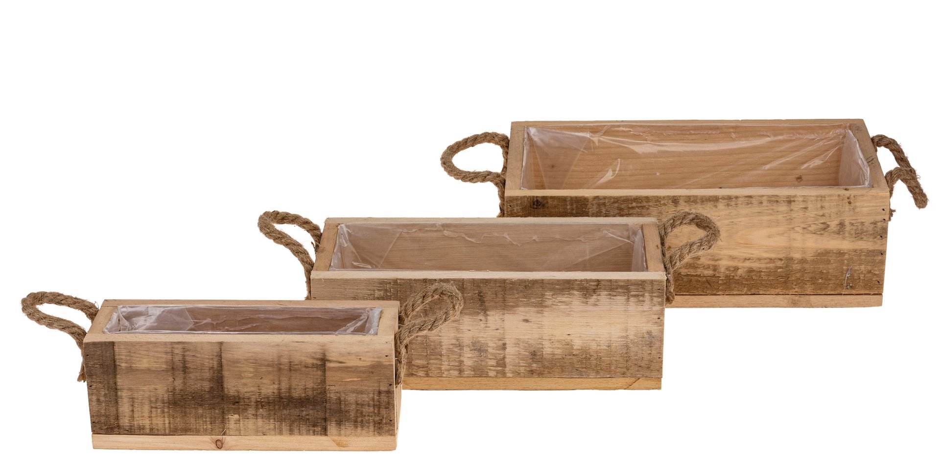 Rechteckige Holzkiste zum Bepflanzen mit Sisalhenkeln. 3er Set. Größen: 20 x 10 x 10 cm, 25 x 14 x 11 cm und 30 x 18 x 12 cm.
