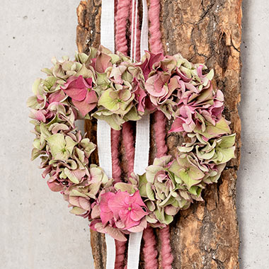 Dieses natürliche Dekoelement besteht aus einem Schwartenbrett, Wolle und einem gewickelten Hortensienherz.