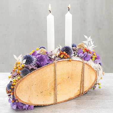 Dieser Kerzenständer besteht aus Birkenscheiben, der mit herbstlichen Blüten gestaltet ist.