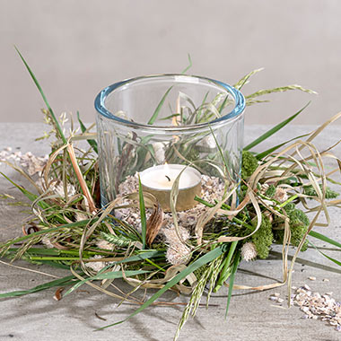 umgeben von einem Gräserkranz und verschiedenen trockenen Naturmaterialien.