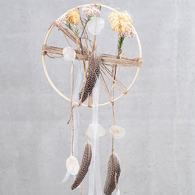 Er ist eine abwechslungsreiche Alternative zum klassischen Flower- Loop und besteht traditionell aus einem kreisförmigen Rahmen, der mit einer gewebten Netzstruktur versehen ist.