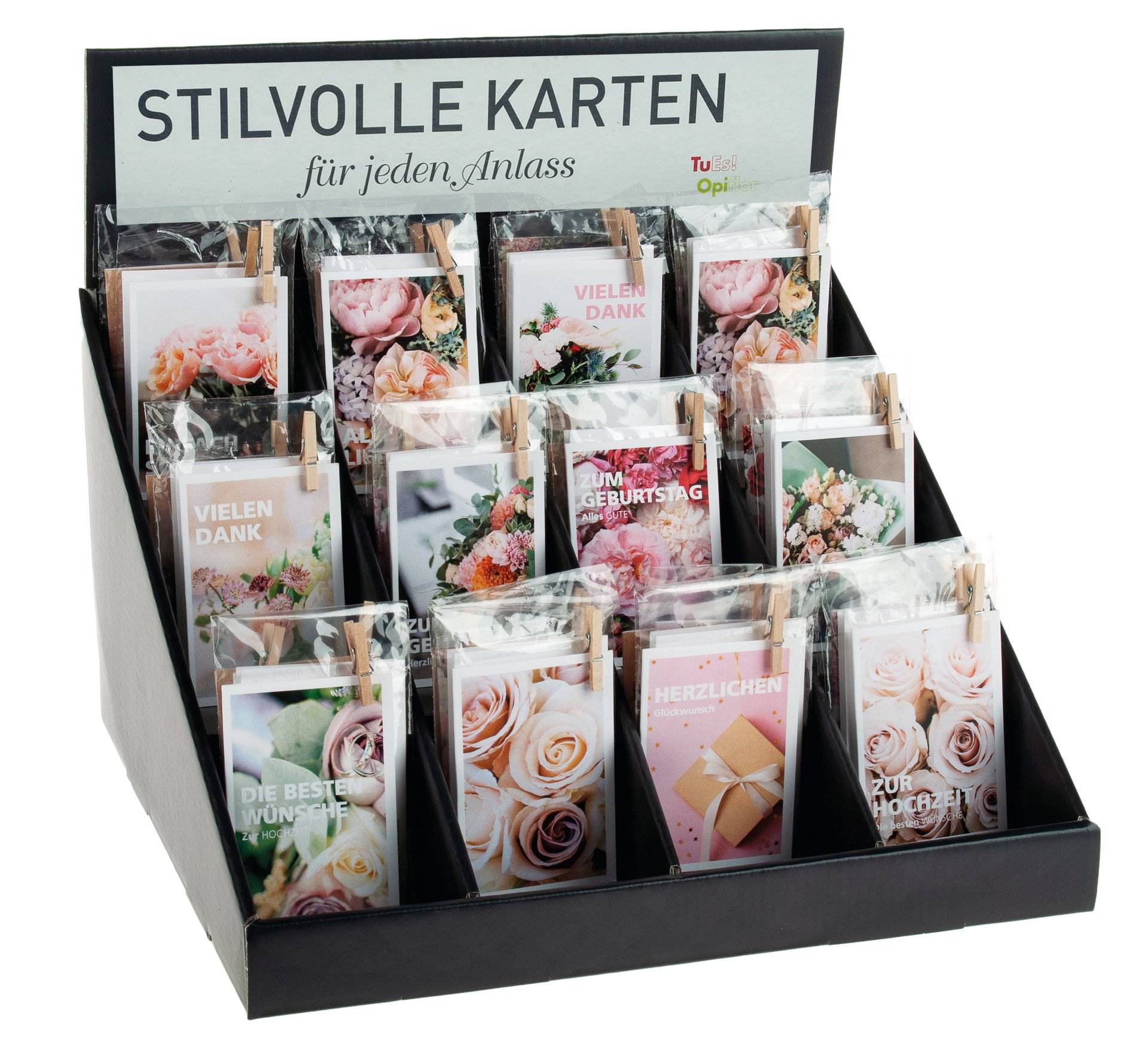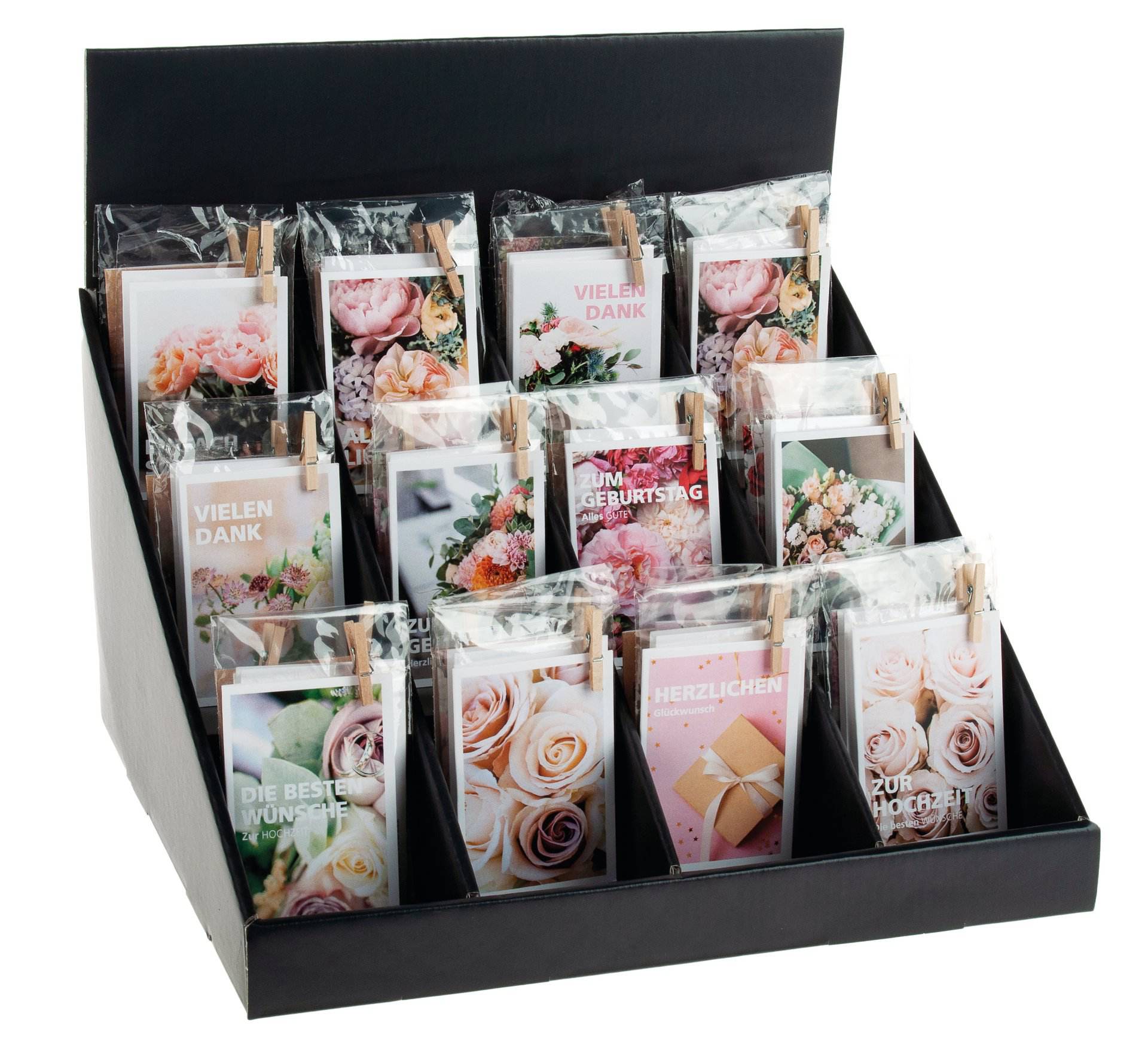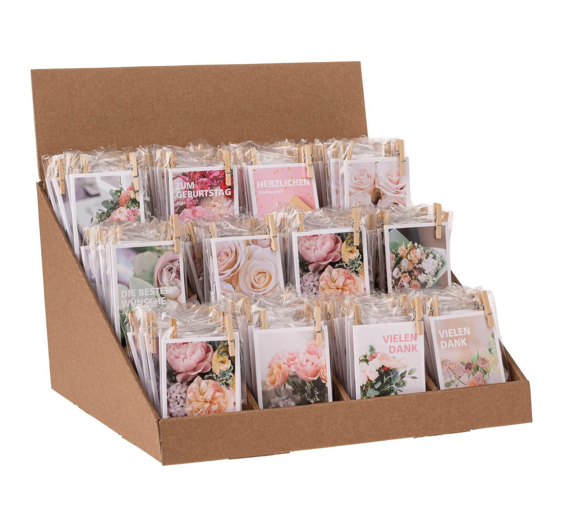 Mini-Karten mit zeitlosen Fotomotiven für allerlei Anlässe. Jede Karte mit Holzklammer und Cellophanverpackung im praktischen Display. Display kann auch ohne Header verwendet werden. Rückseite des Headers blanko. Inhalt: 1 Display mit 144 Karten - 12fach sortiert (12 x 12 Karten).