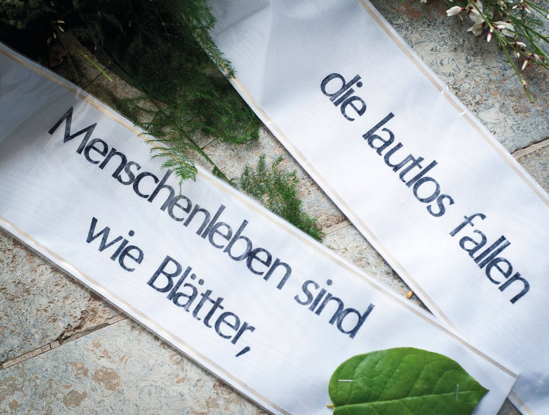 Hochwertiges Satin-Kranzband mit edel bedrucktem Goldrand (Motiv Efeu) in verschiedenen Breiten. Länge: 25 m.