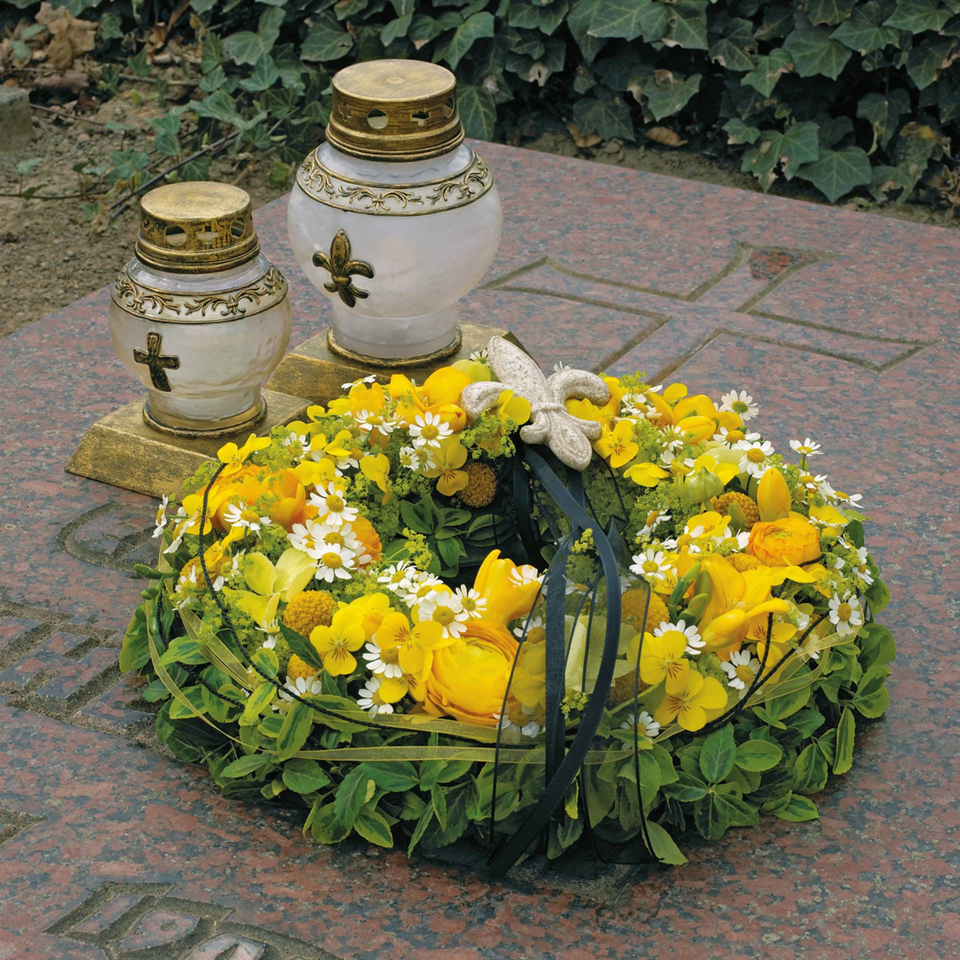 Die Besonderheit der Sargauflage Viti® ist der Holzboden. Die mittige Aussparung garantiert eine sichere Verankerung der Vitifix (N° 194935) im Steckschaum. Bei jeder Sargauflage Viti® sind pro VE zwei Vitifix inklusive. Die kleinste Größe N° 111111 enthält nur ein Vitifix.