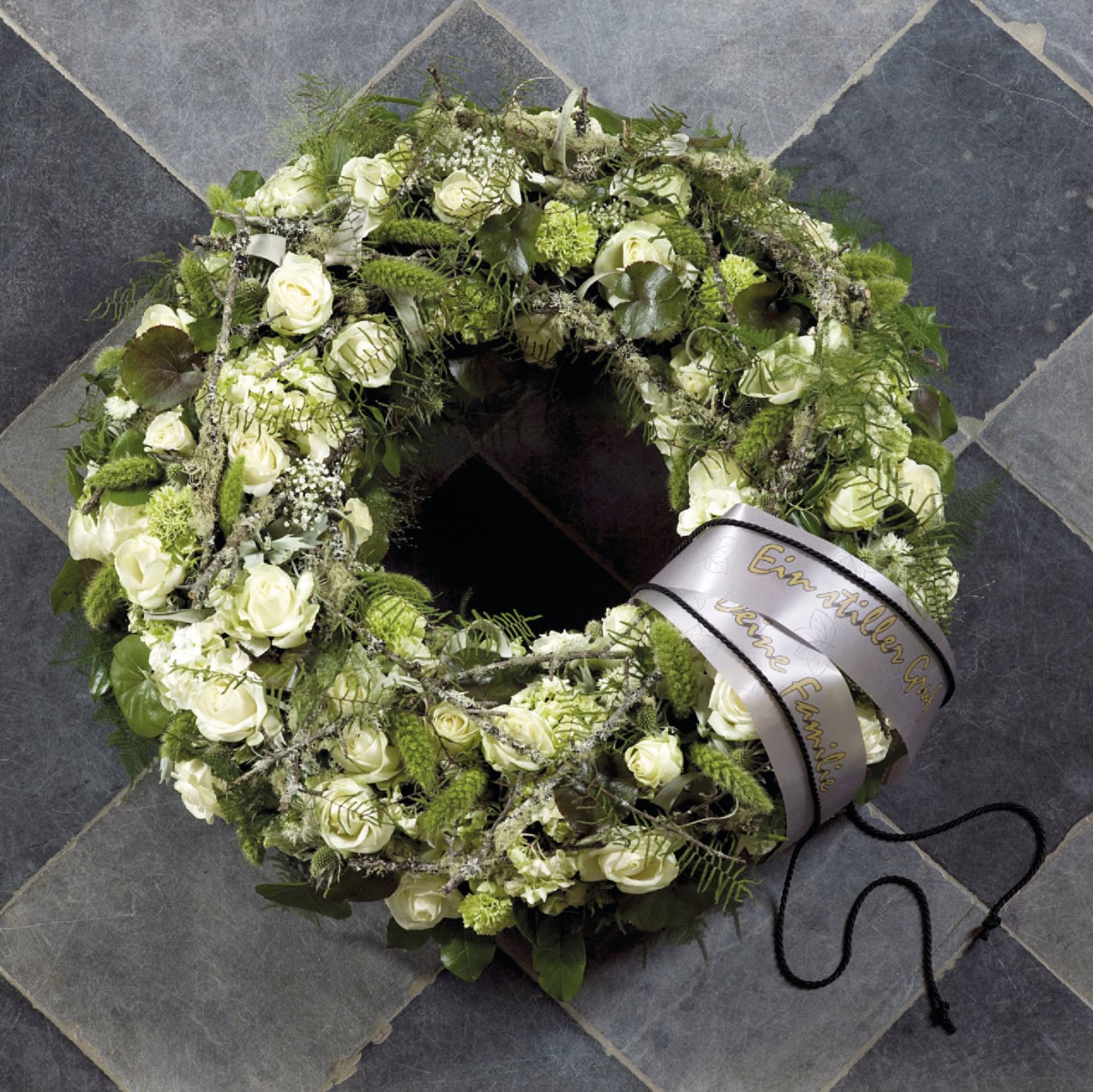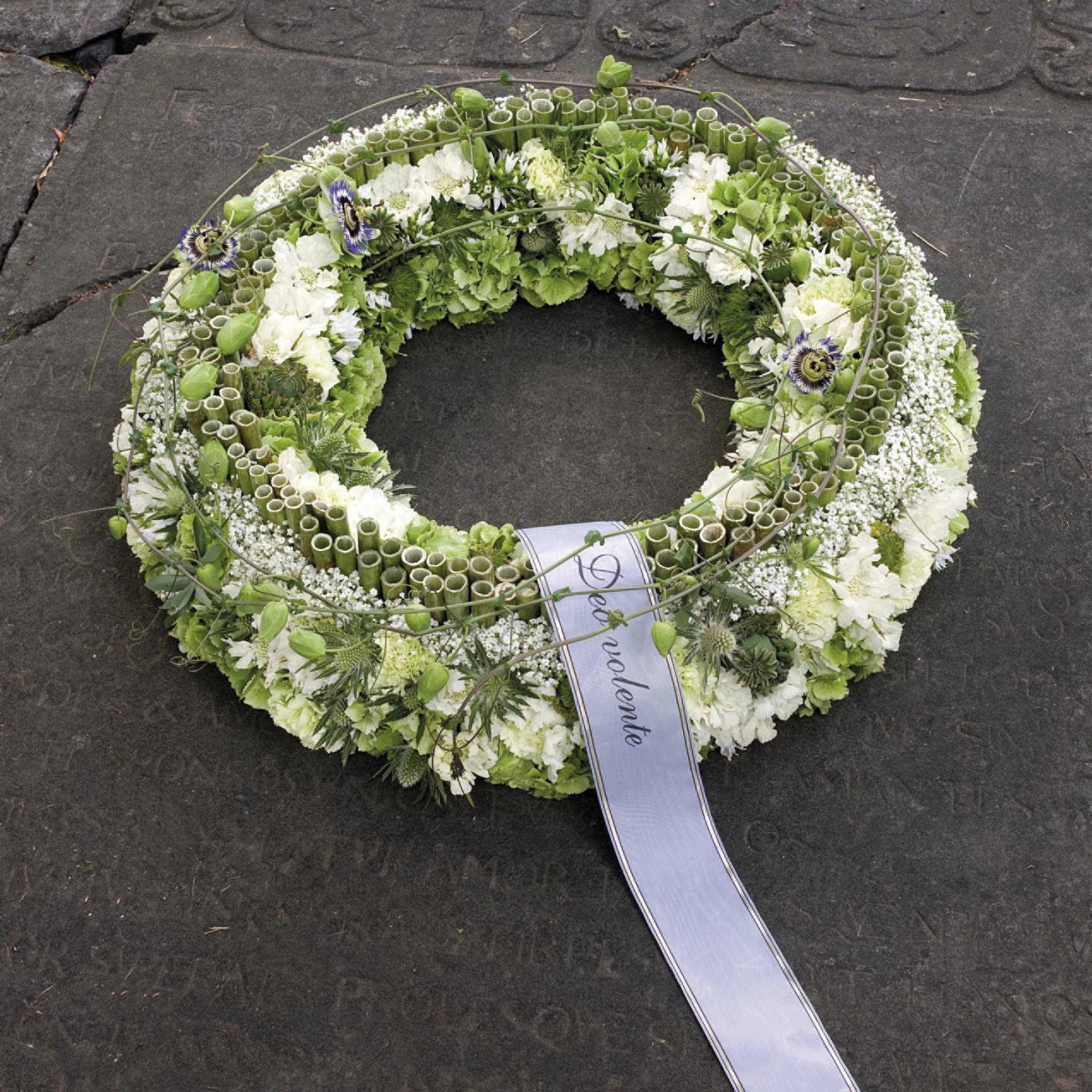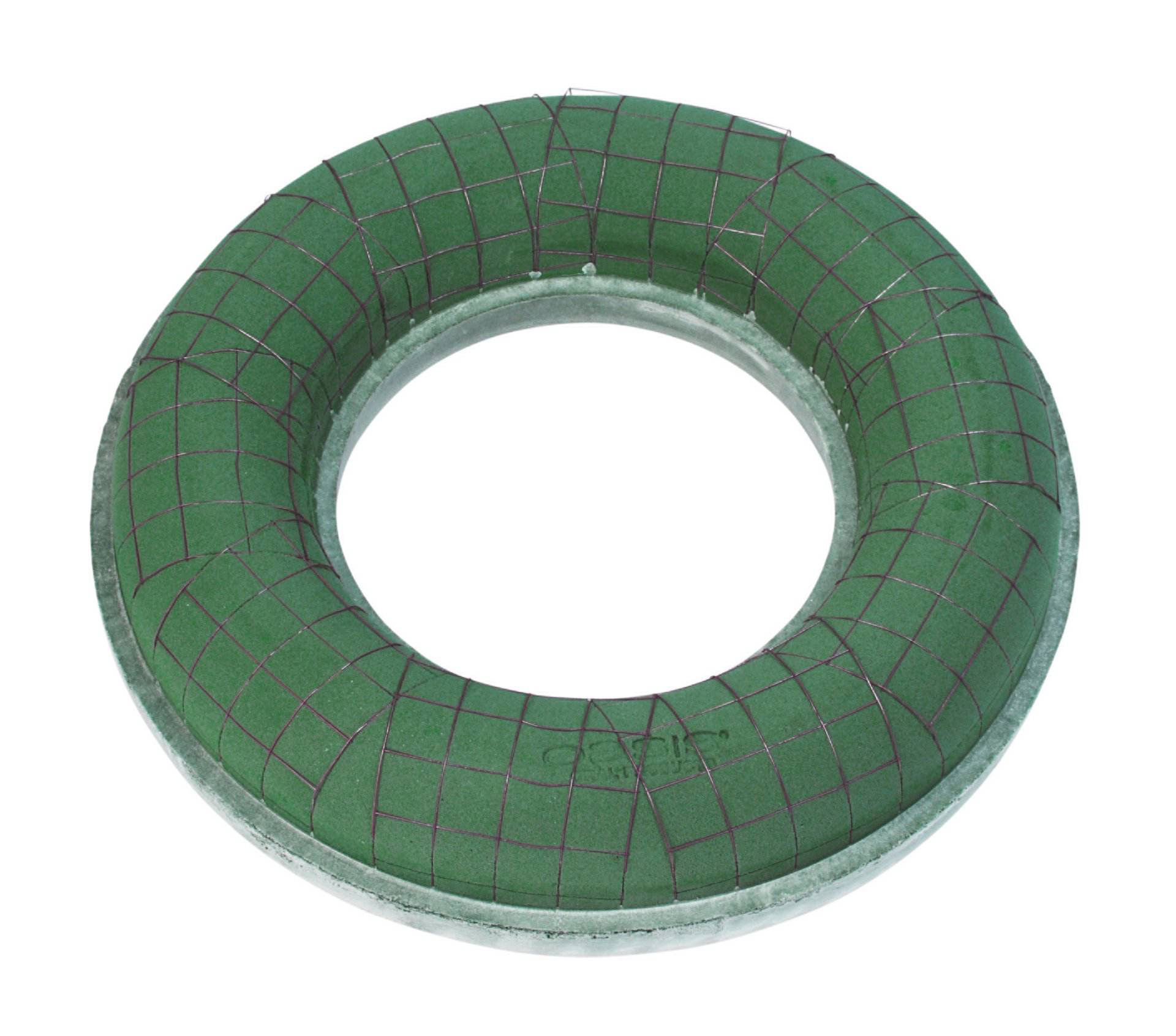 Nass-Steckschaumkranz mit stabiler Holzunterlage, abgeschrägten Steckkanten und Gitterdrahtmantel. Innen-Ø: N° 113951 Ø 26,5 cm, N° 116551 Ø 39 cm, N° 116651 Ø 47 cm, N° 116751 Ø 56 cm.