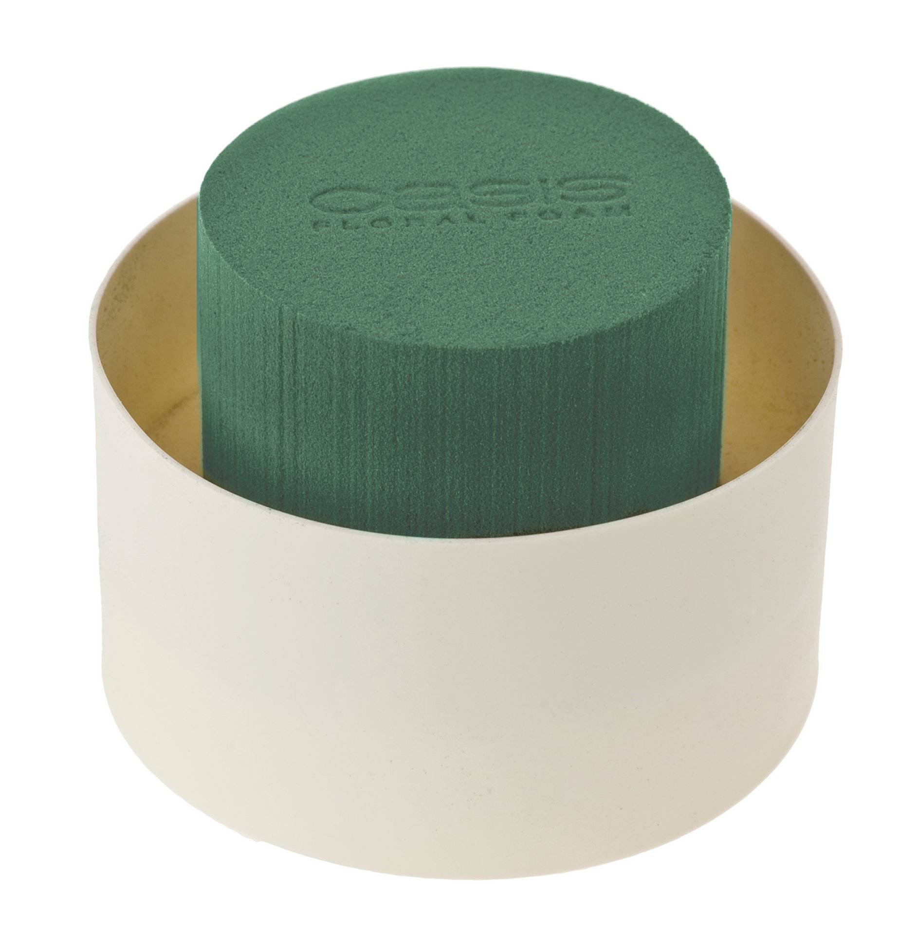 Flacher Nass-Steckschaumzylinder in Kunststoffschale zum bequemenNachwässern.