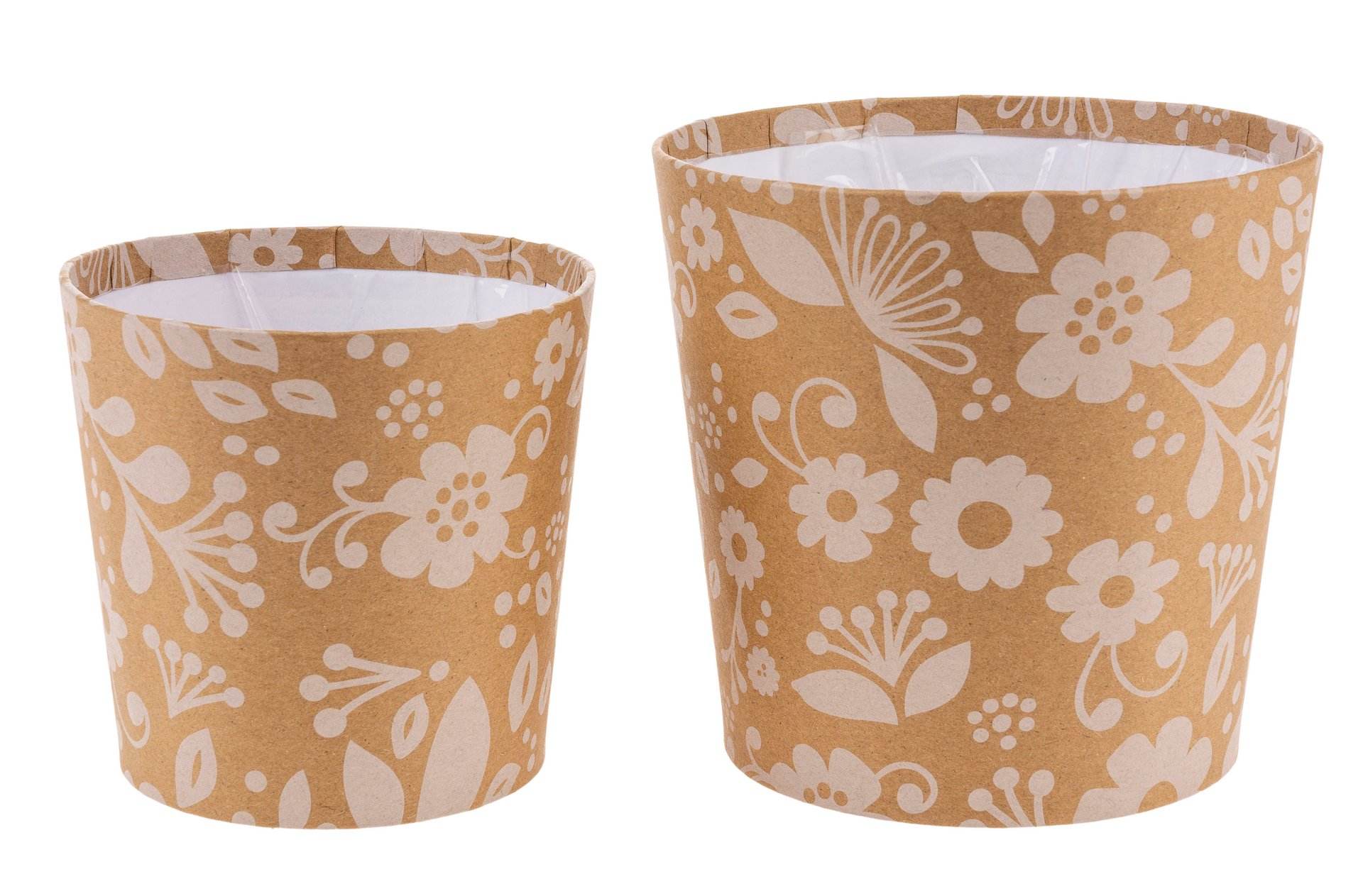 Konischer Übertopf aus Kraftpapier mit floralem Design. Innen foliert.