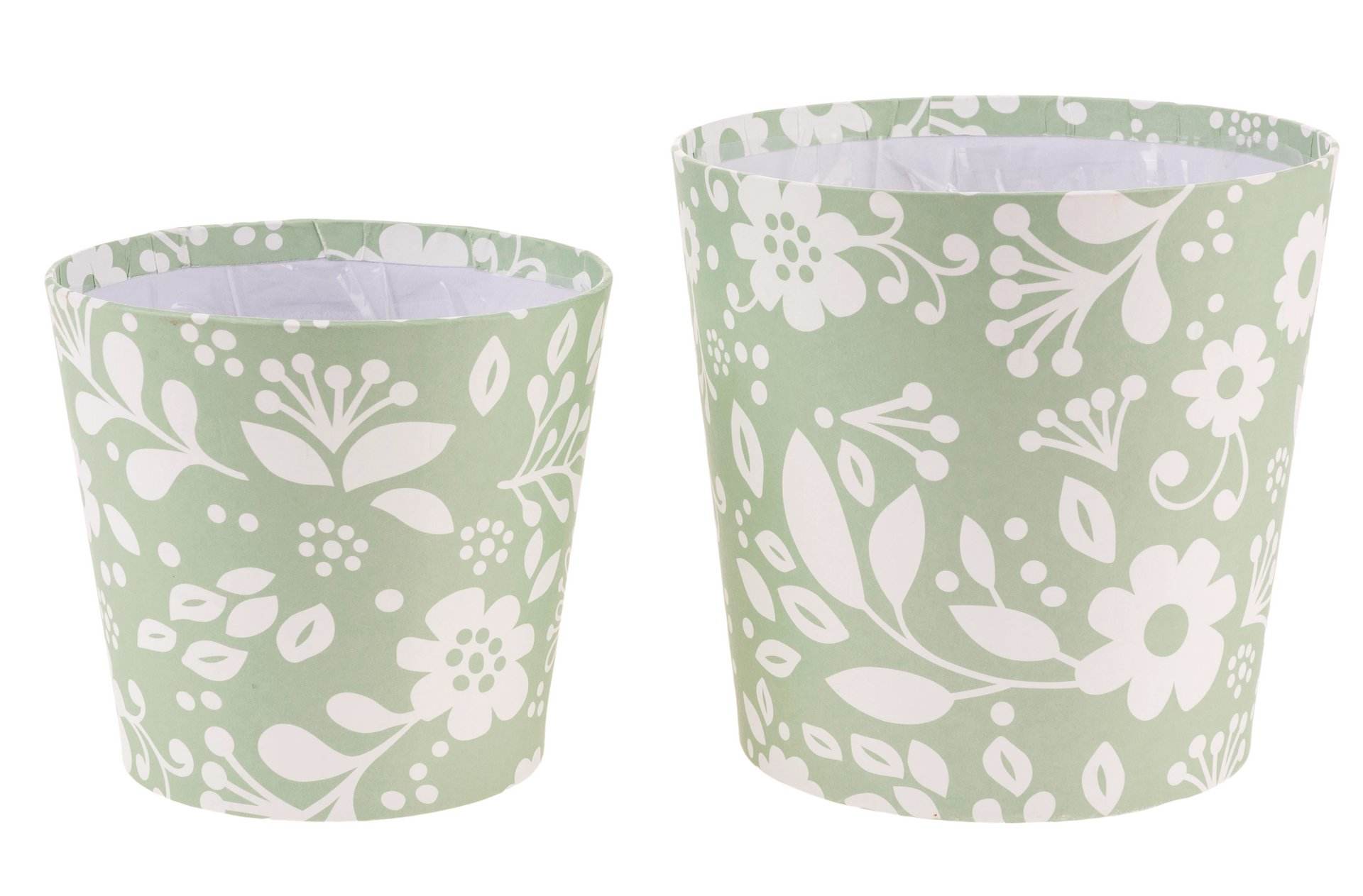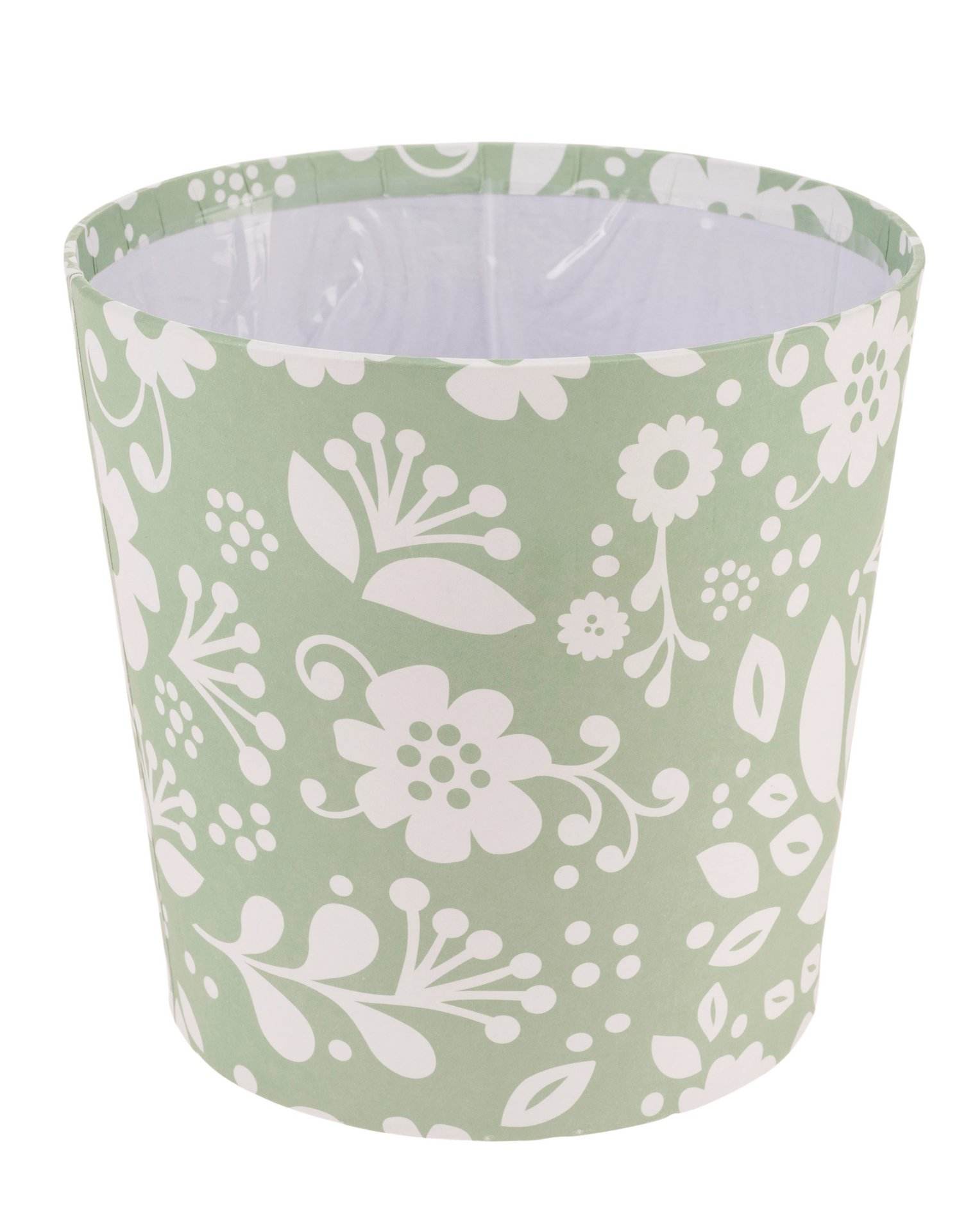 Konischer Übertopf aus Kraftpapier mit floralem Design. Innen foliert.