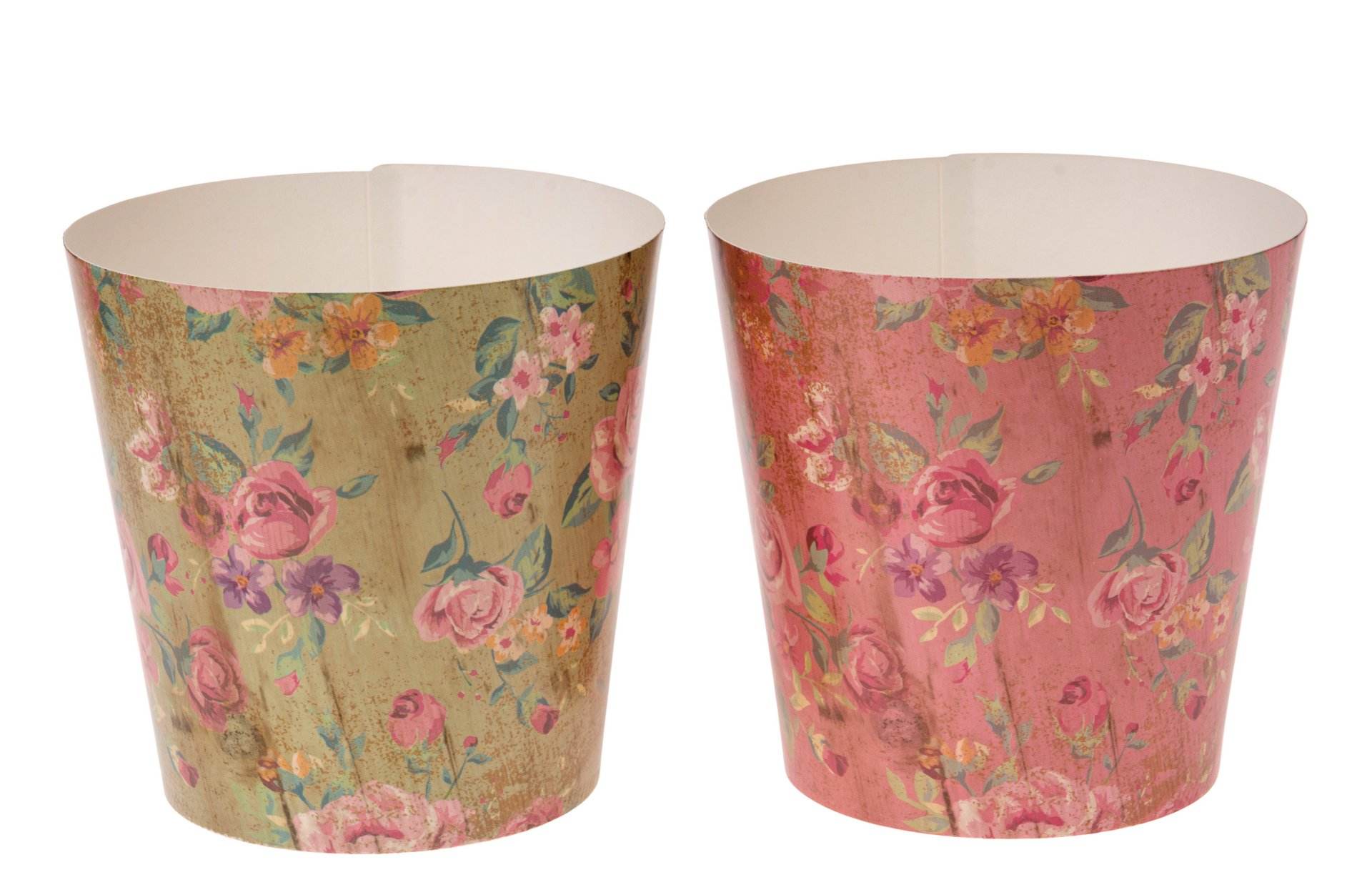 Konischer Übertopf aus Kraftpapier mit floralem Design. Innen wasserabweisend beschichtet.