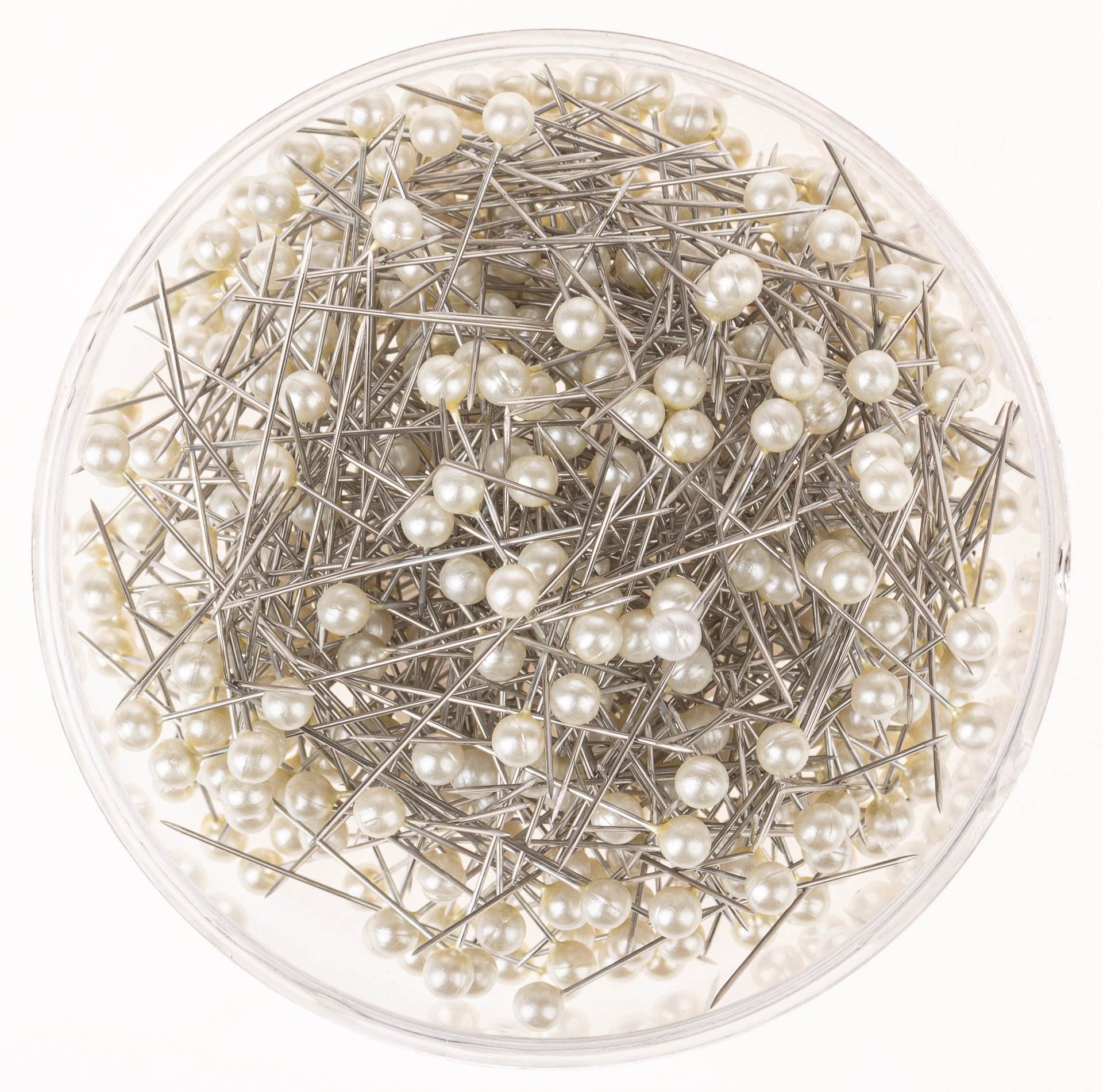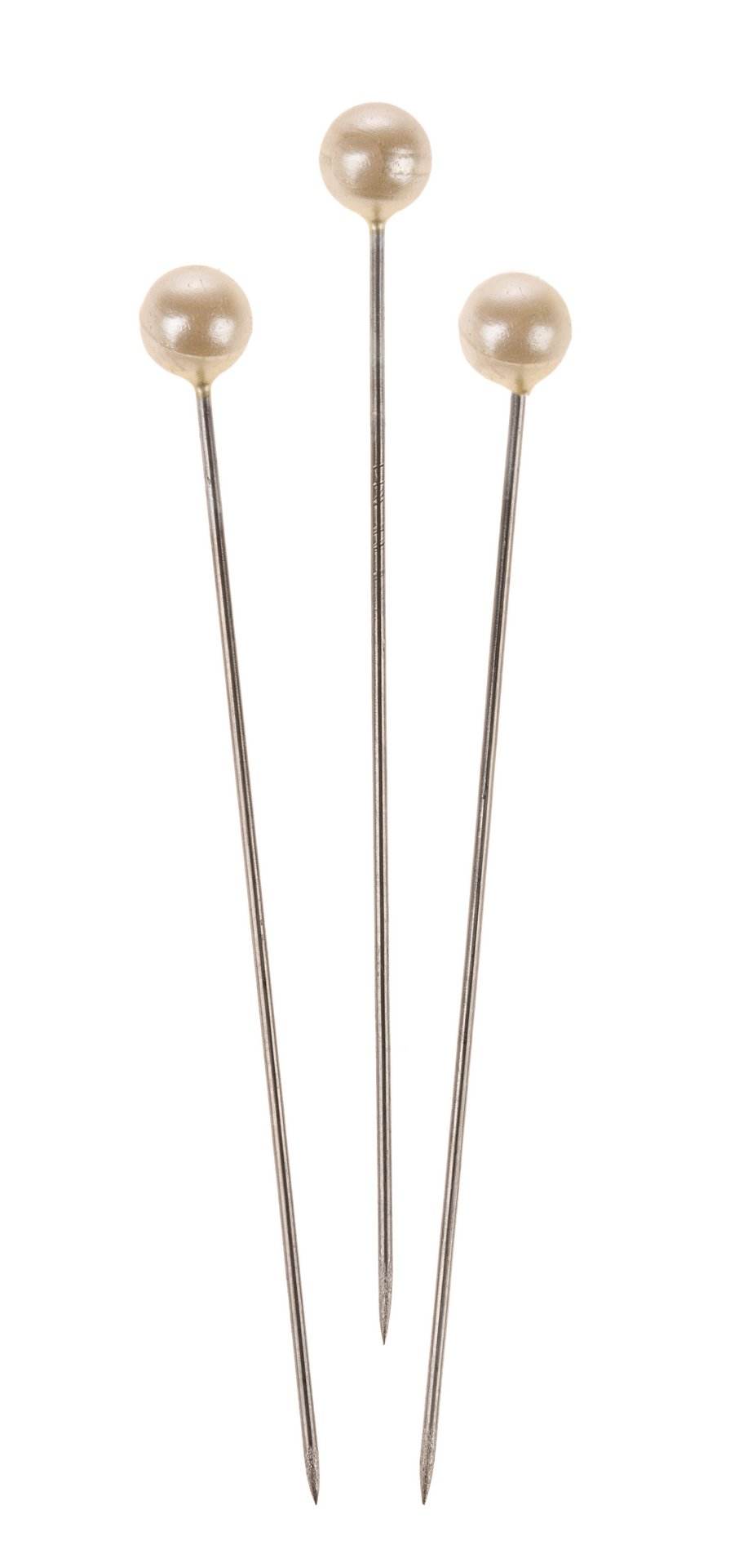 Runde Perlen festsitzend auf einer stabilen und spitzen Nadel.
