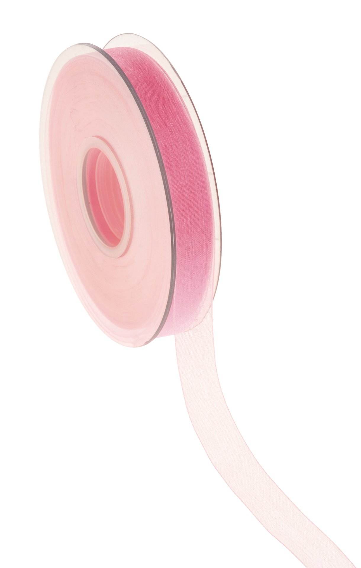 Zartes Organzaband mit gewebter Kante. Größen: 6 mm x 50 m, 15 mm x 50 m und 25 mm x 50 m.