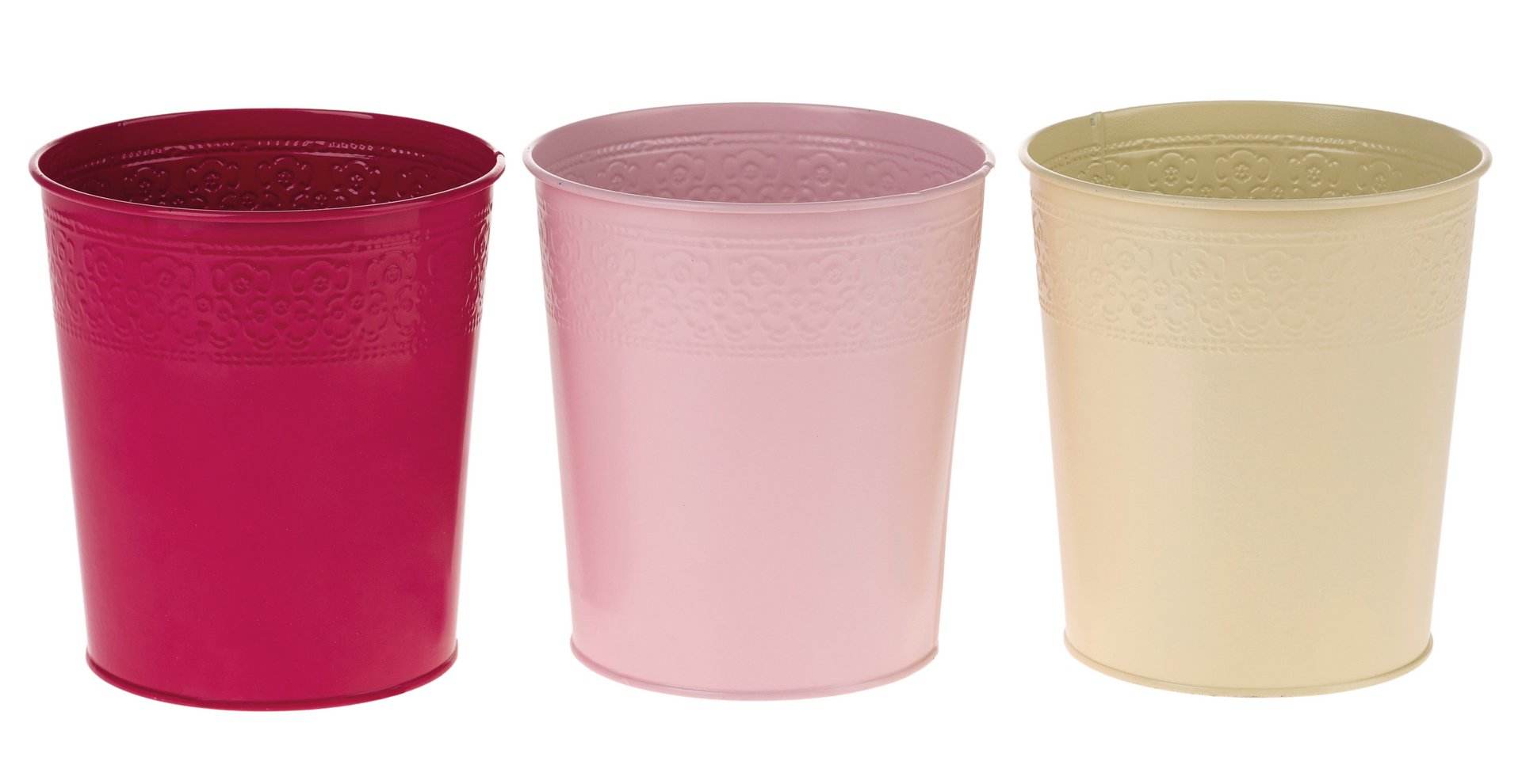 Lackierter Zinktopf mit Ornamentrelief. 3-farbig sortiert = 8 Stück je Farbe.