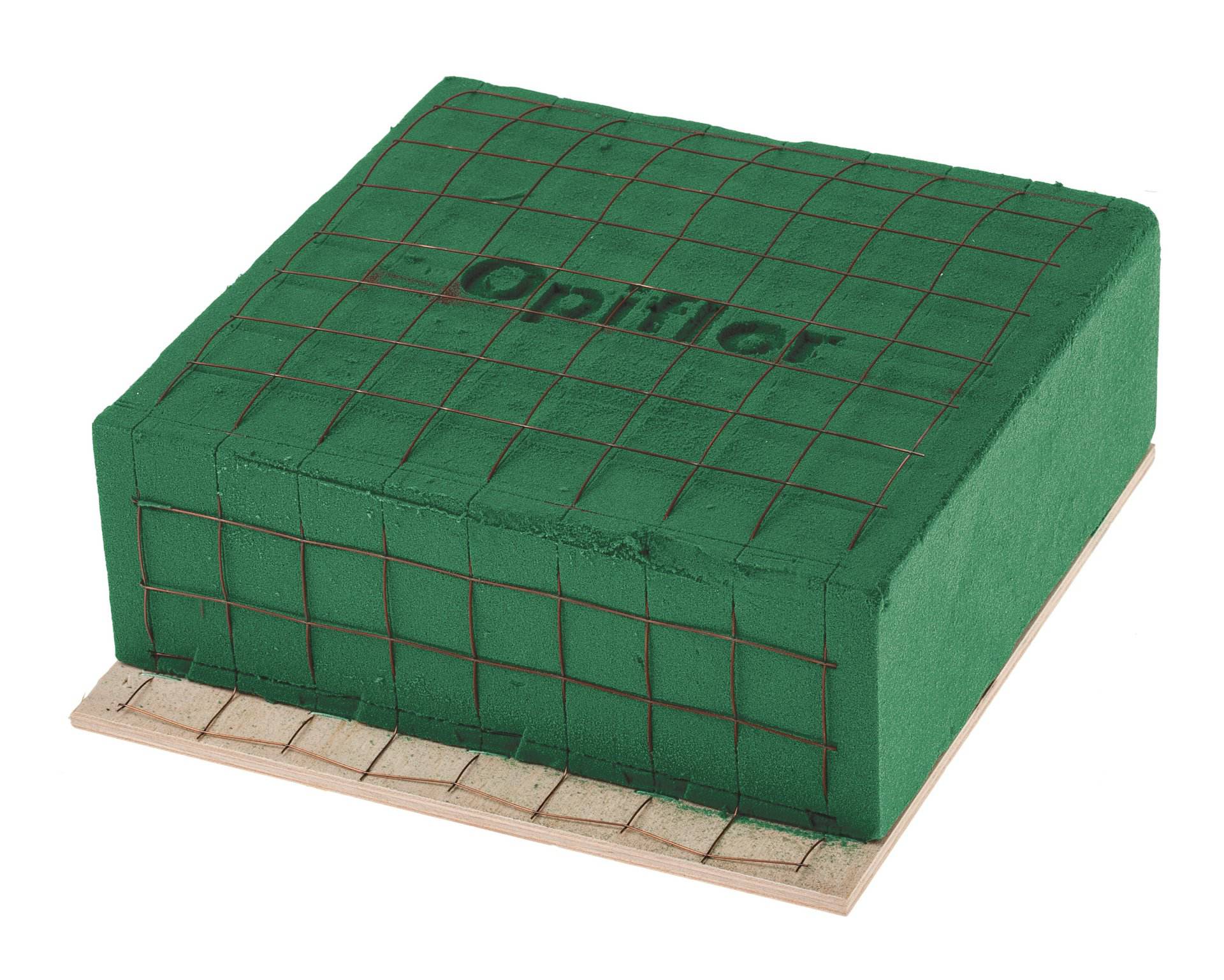 Bewährter und preisgünstiger Nass-Steckschaumziegel in doppelter Breite mit Gitterdraht und auf einer Holzunterlage mit praktischer Kante zum einfachen Greifen.