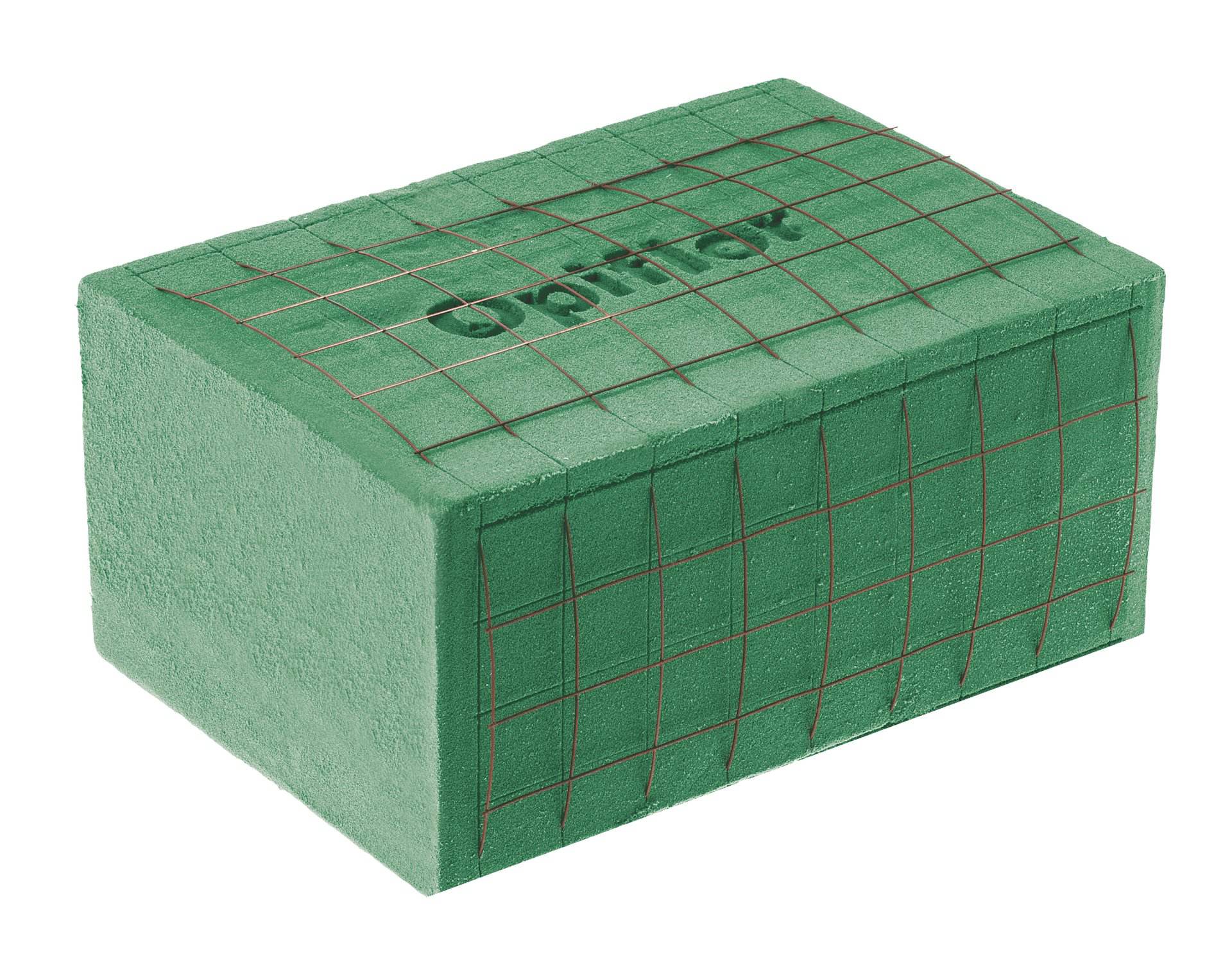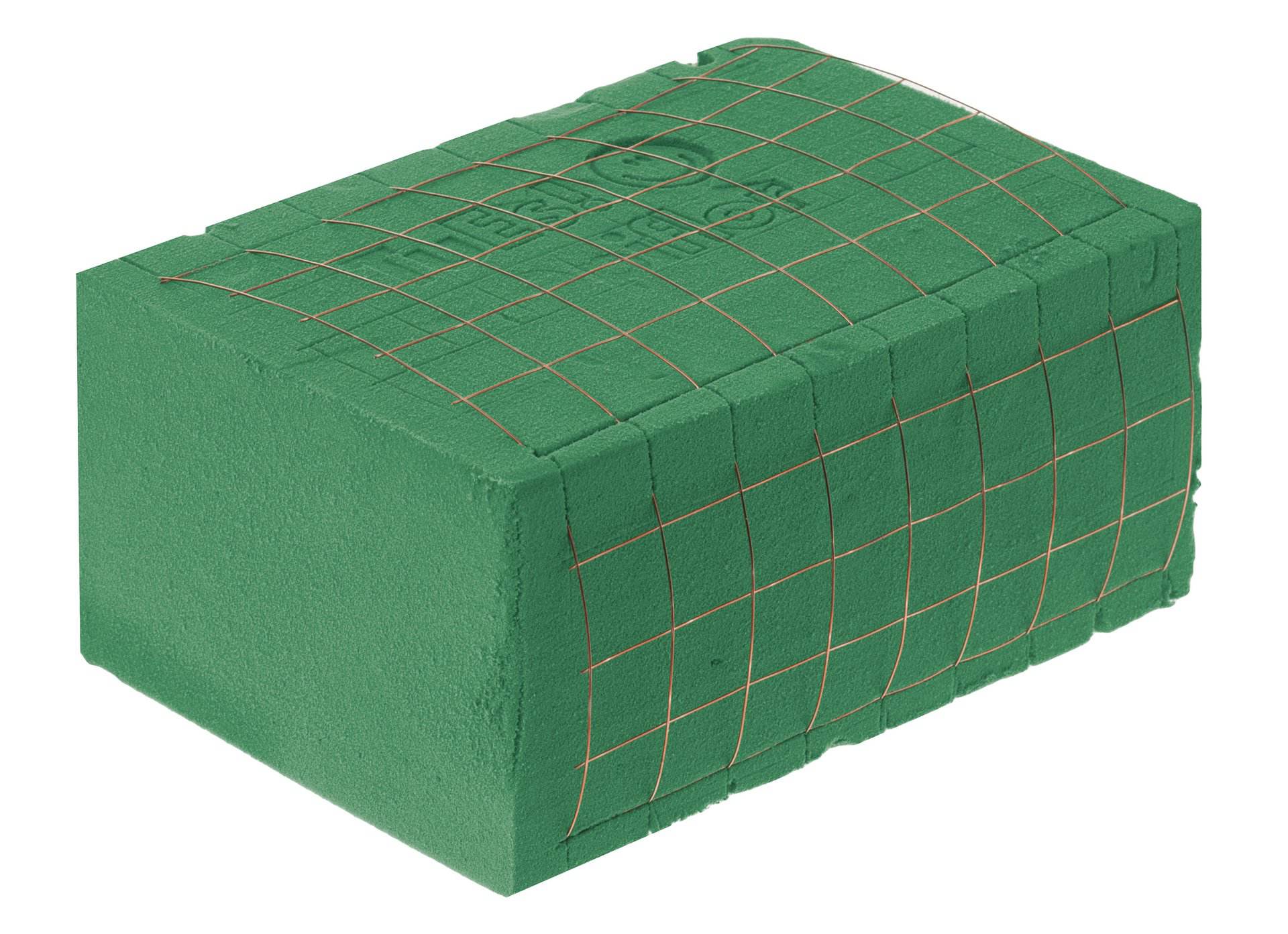 Bewährter und preisgünstiger Nass-Steckschaumziegel in doppelter Breite, ummantelt mit Gitterdraht.