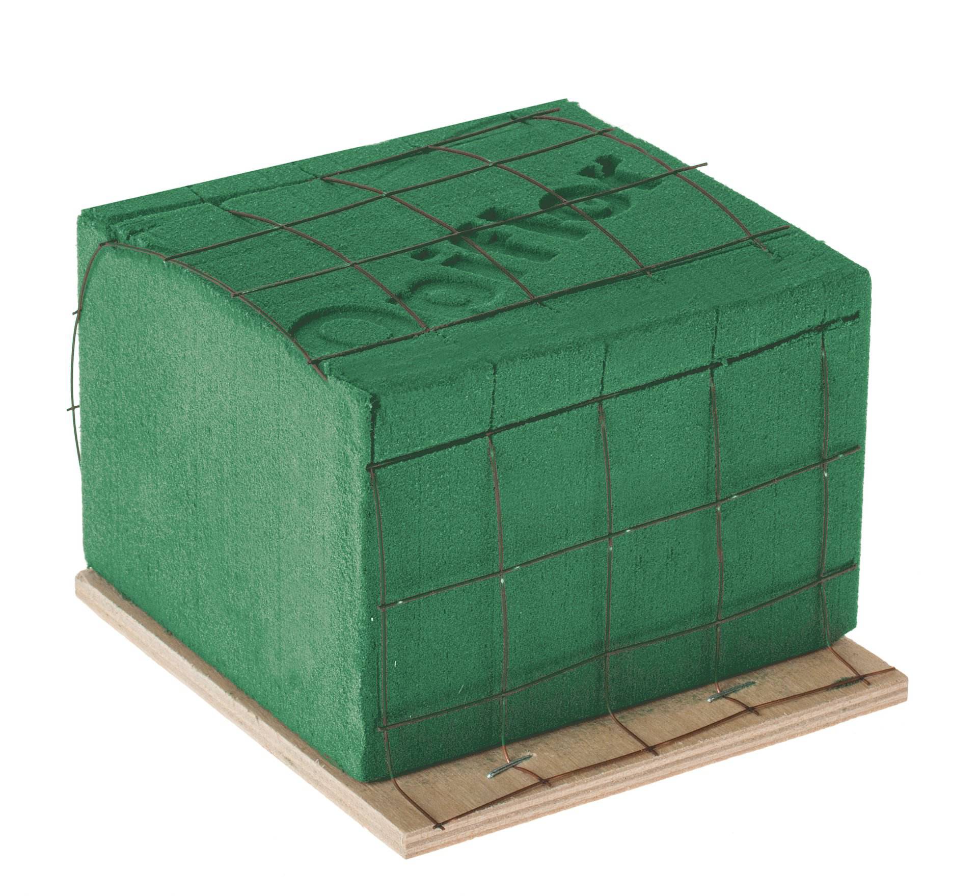 Bewährter und preisgünstiger Nass-Steckschaumziegel in 1/2 Größe, ummantelt mit Gitterdraht und auf einer Holzunterlage mit praktischer Kante zum einfachen Greifen.