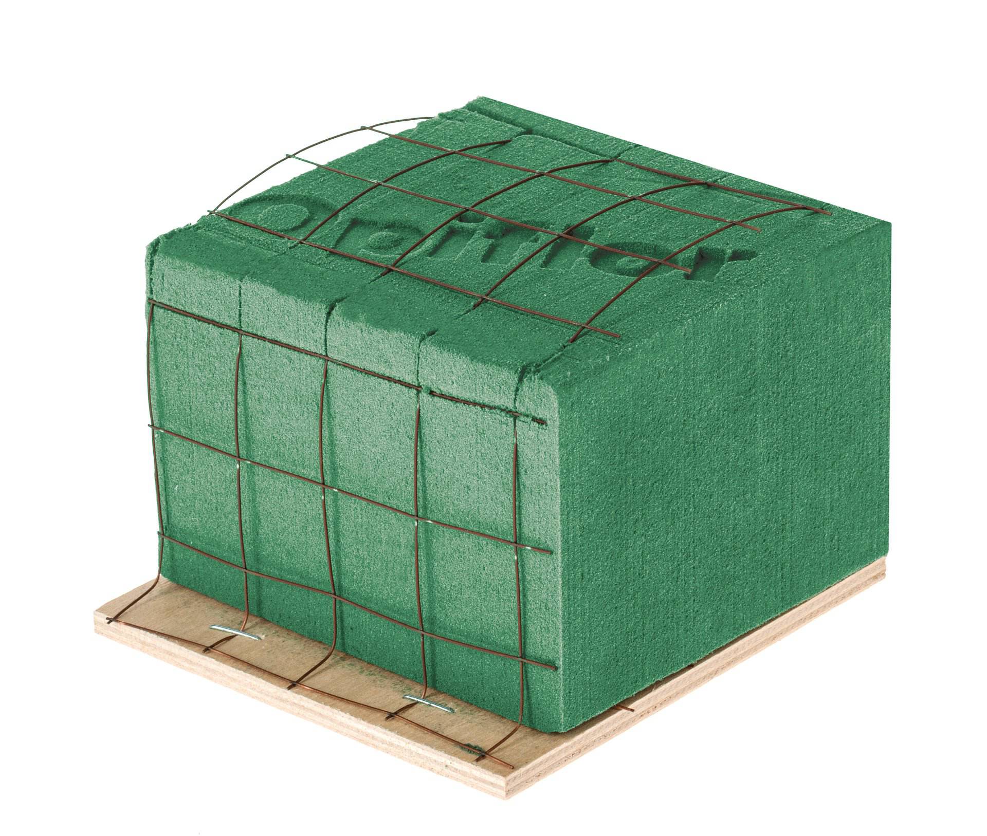Bewährter und preisgünstiger Nass-Steckschaumziegel, ummantelt mit Gitterdraht und auf einer Holzunterlage mit praktischer Kante zum einfachen Greifen.