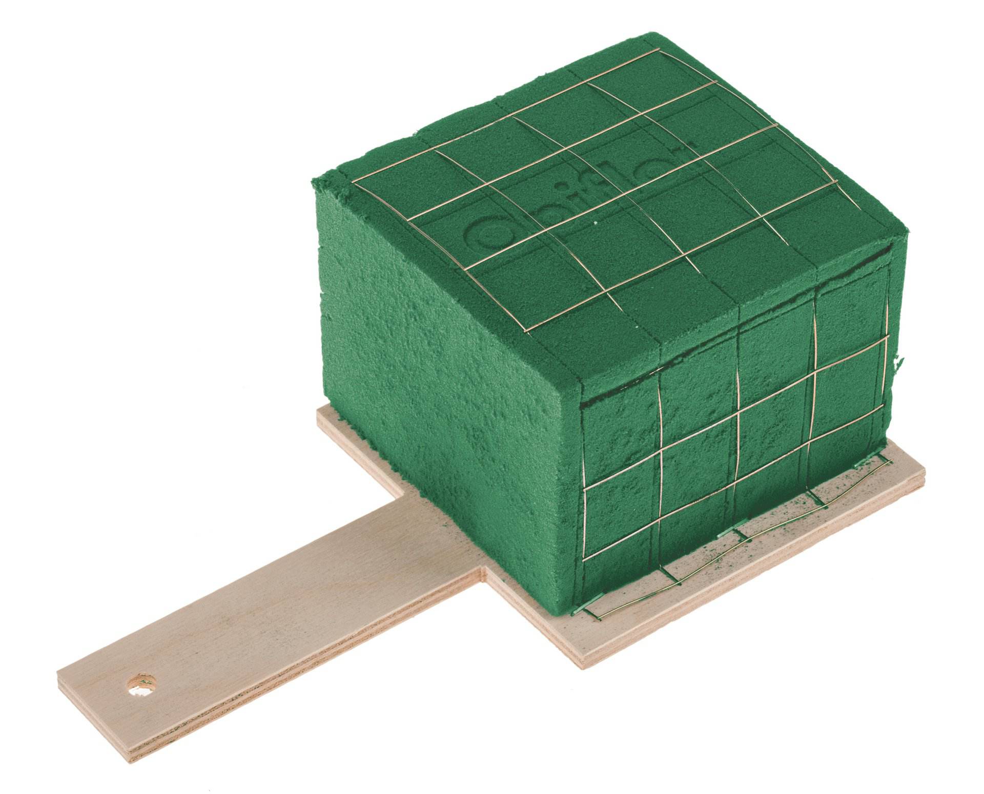 Bewährter und preisgünstiger Nass-Steckschaumziegel in 1/2 Größe, ummantelt mit Gitterdraht und auf einer Holzunterlage. Der praktische Griff (11 cm) zum Tragen hat ein vorgebohrtes Loch zur einfachen Befestigung.