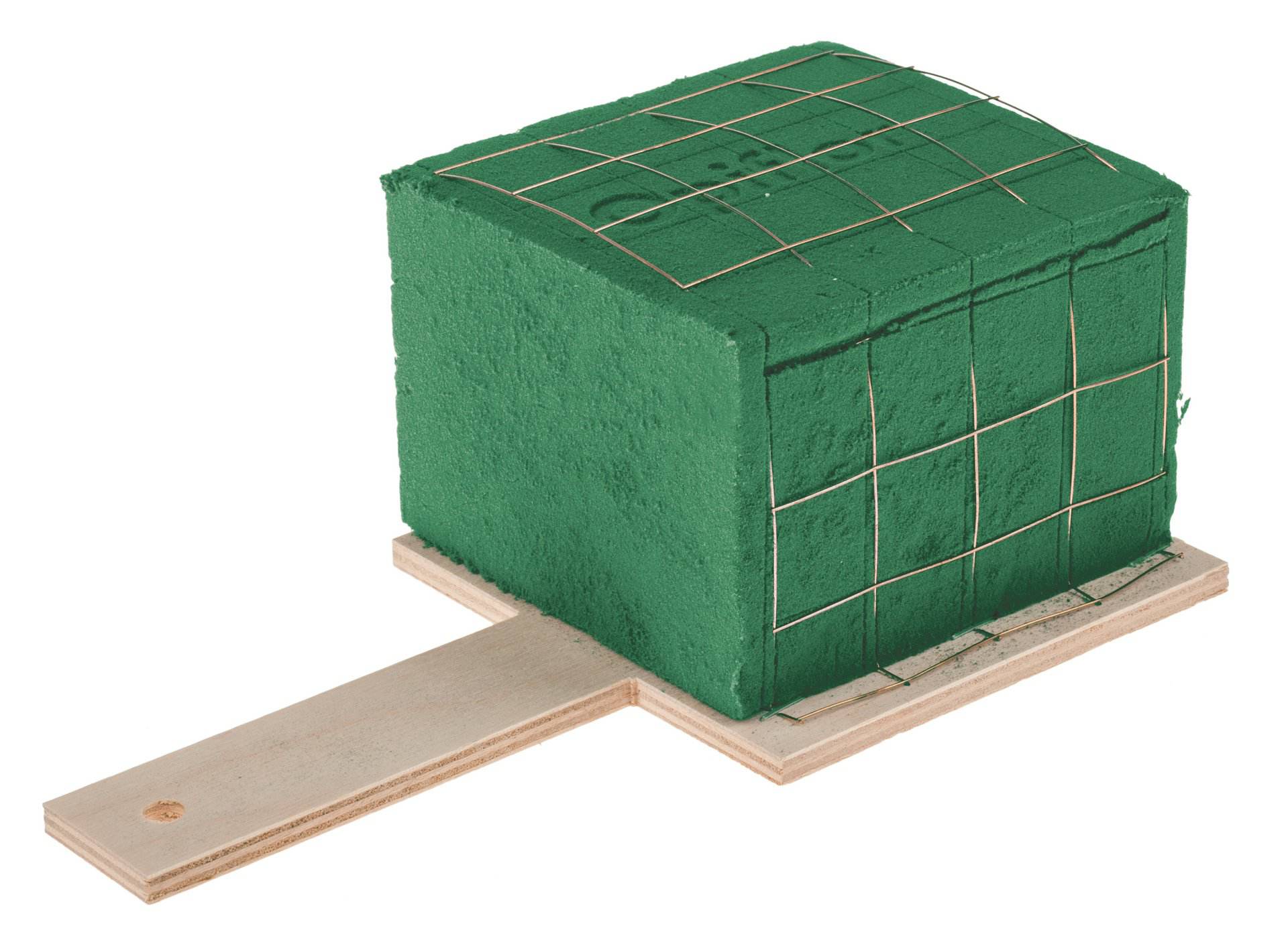 Bewährter und preisgünstiger Nass-Steckschaumziegel in 3/4 Größe, ummantelt mit Gitterdraht und auf einer Holzunterlage. Der praktische Griff (11 cm) zum Tragen hat ein vorgebohrtes Loch zur einfachen Befestigung.