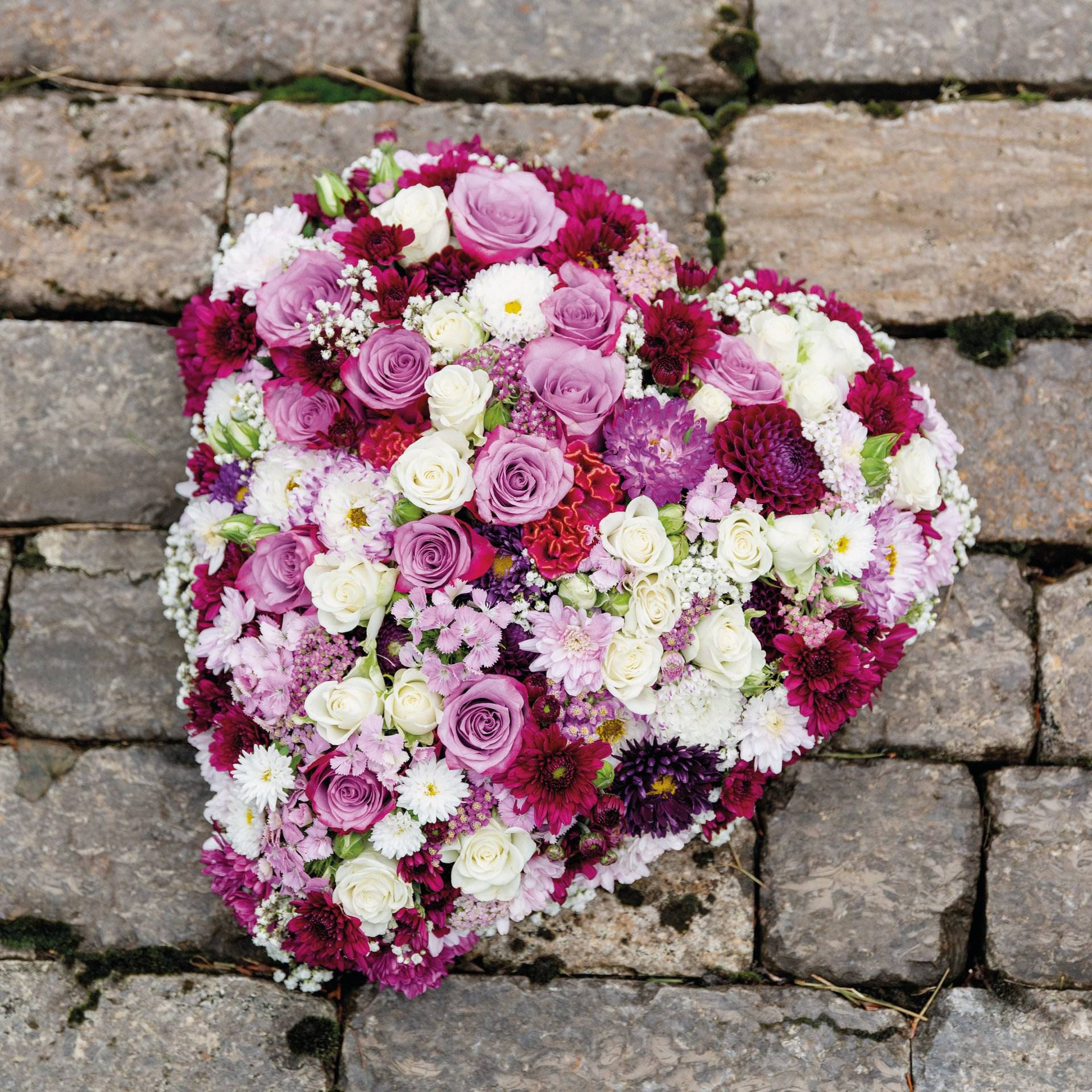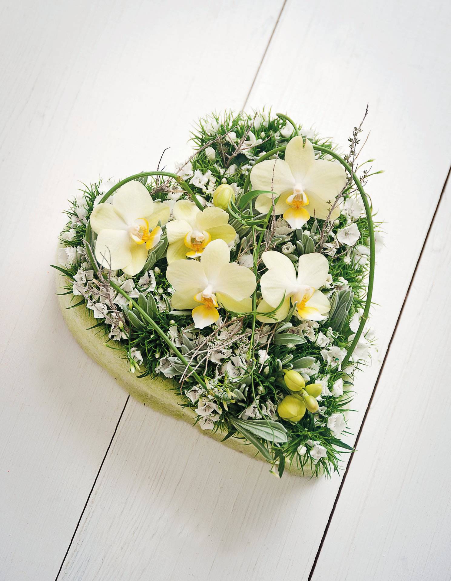 Nass-Steckschaumherz mit Drainage und stabiler Holzunterlage, zum Stellen. Die Urne steht auf einem stabilen Holzpodest.