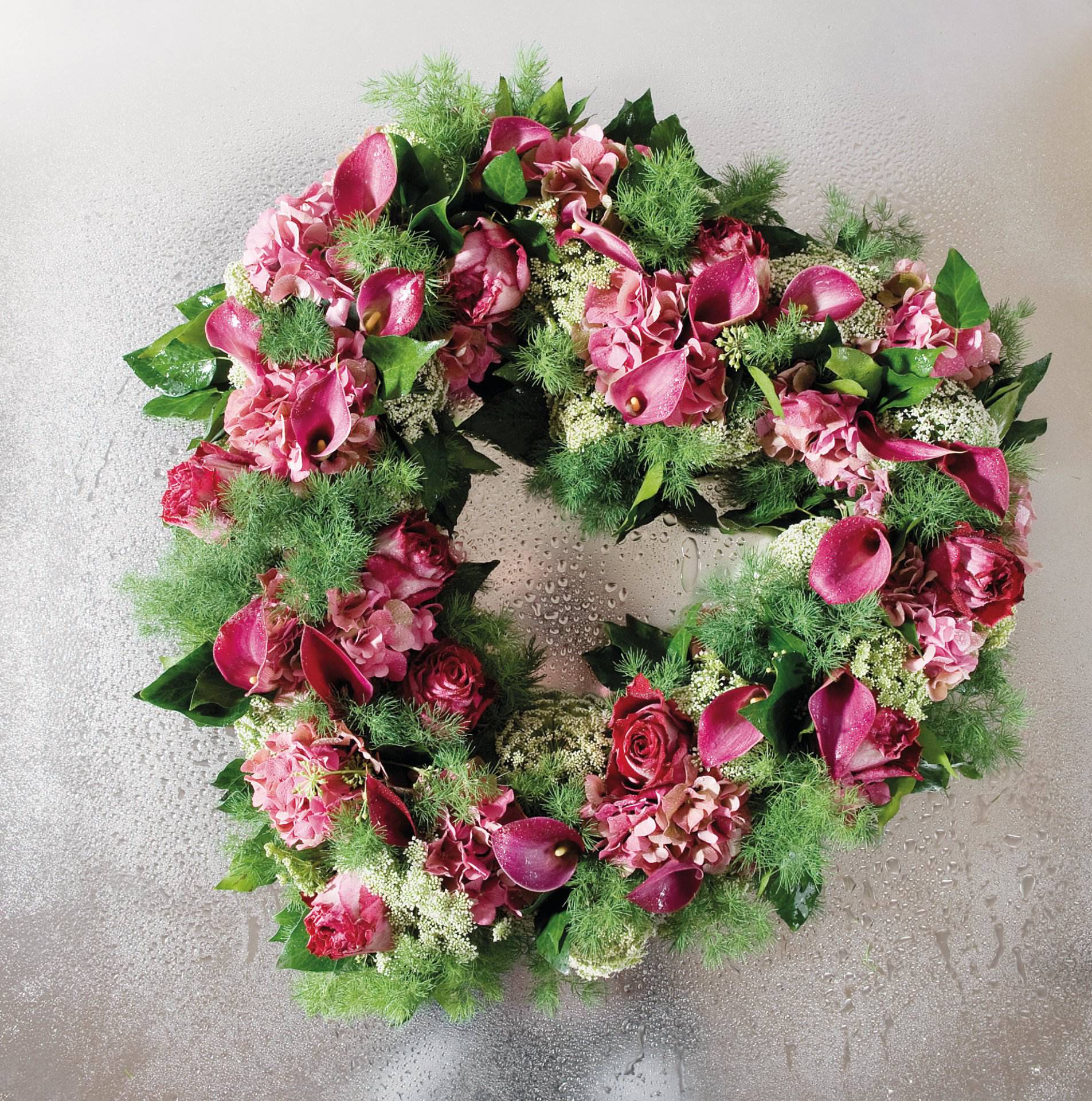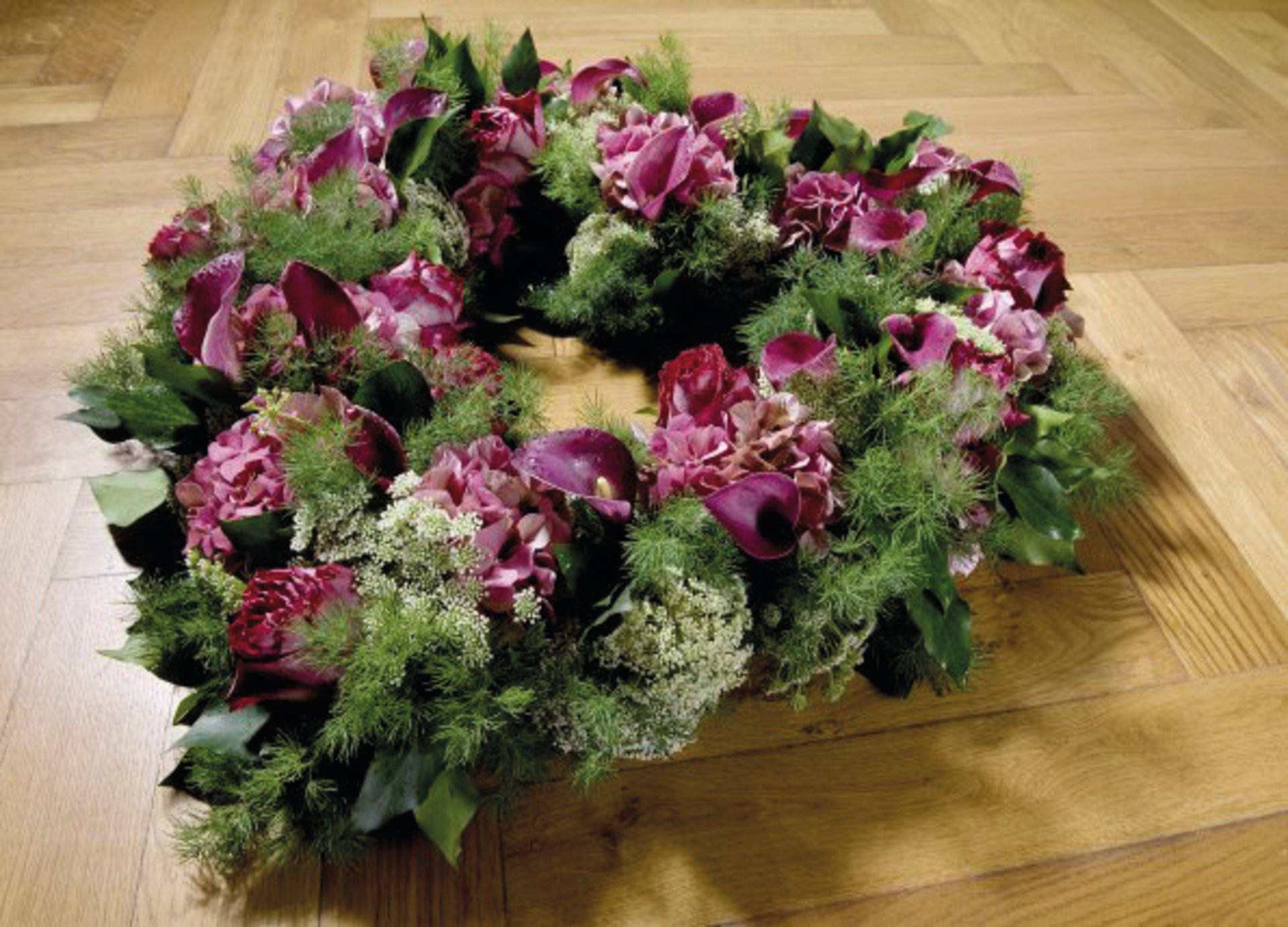 Nass-Steckschaumkranz mit stabiler Holzunterlage, abgeschrägten Steckkanten und Gitterdrahtmantel. Innen-Ø: N° 113951 Ø 26,5 cm, N° 116551 Ø 39 cm, N° 116651 Ø 47 cm, N° 116751 Ø 56 cm.