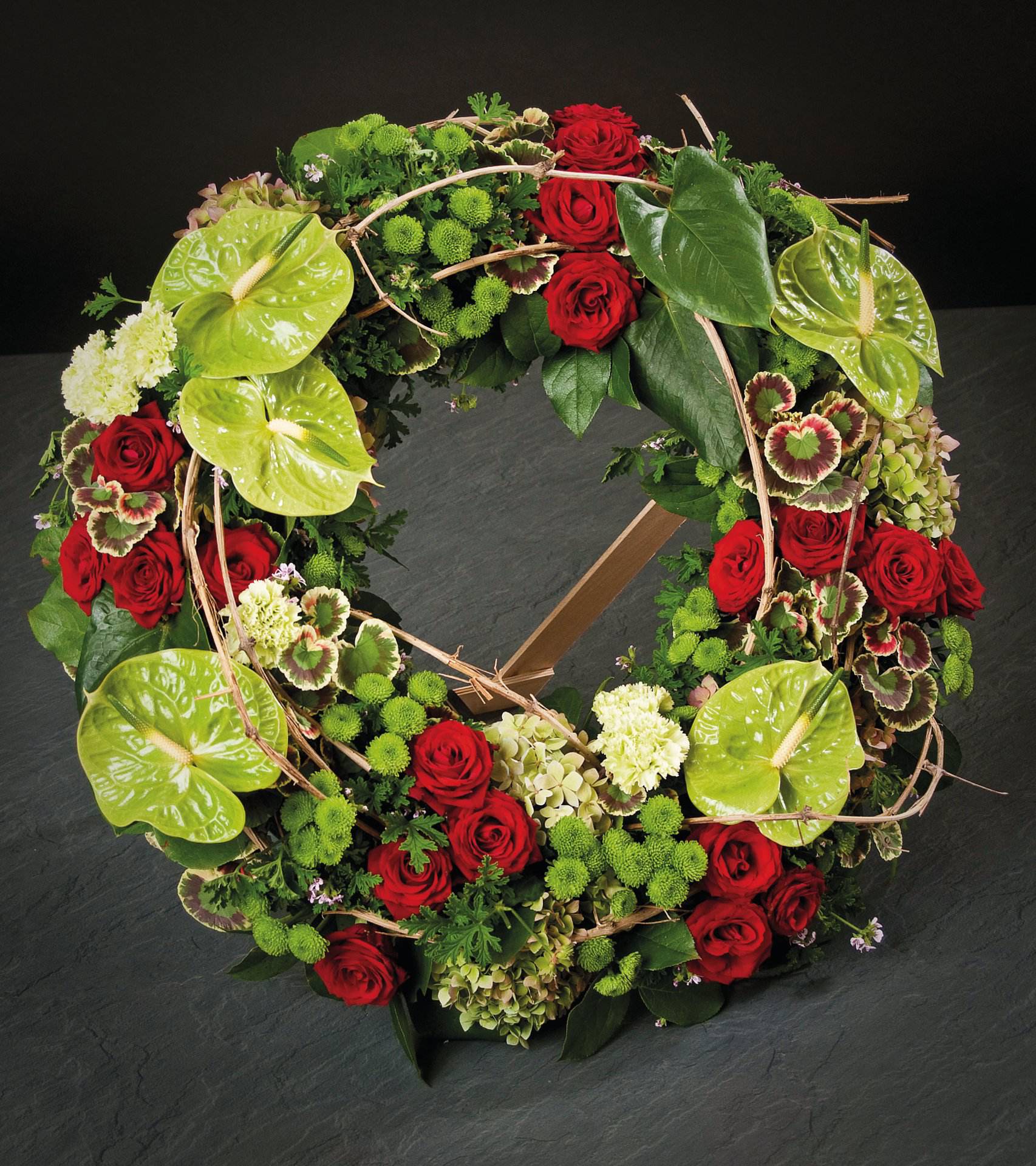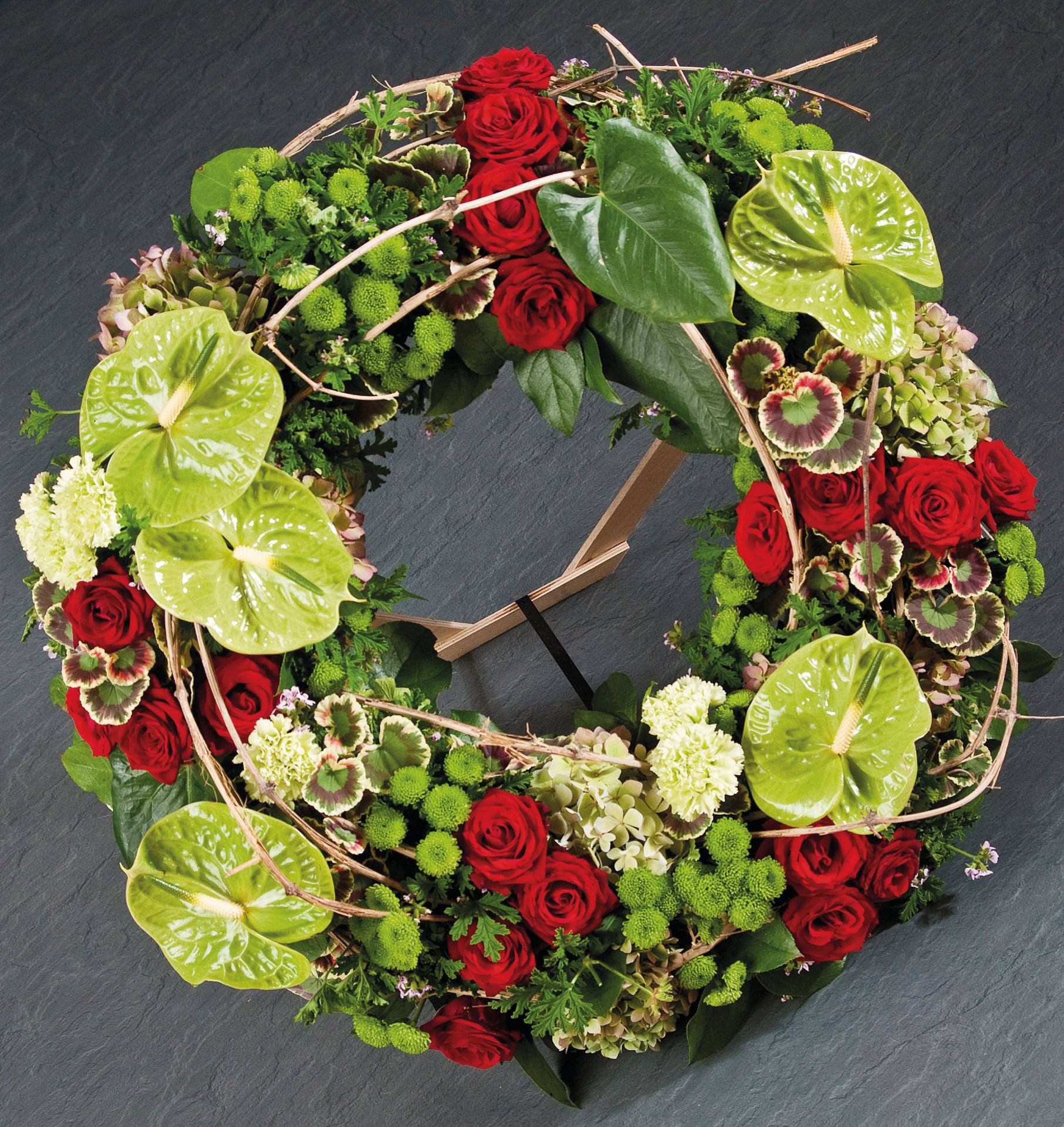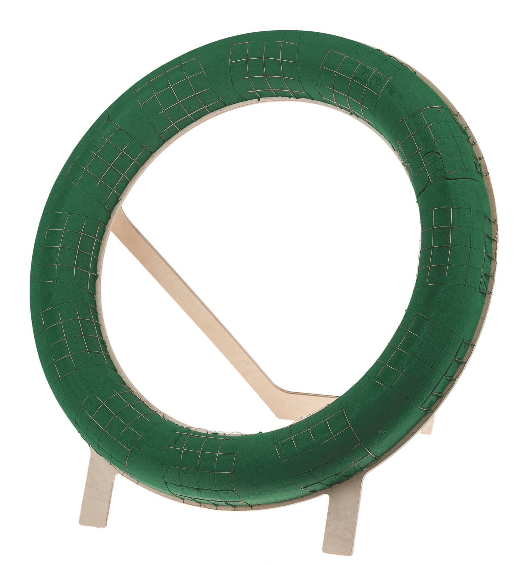 Großer Nass-Steckschaumkranz mit Gitterdrahtmantel und stabiler Holzunterlage, zum Stellen. Innenmaße: N° 116559 Ø 36 cm, N° 116659 Ø 58 cm.