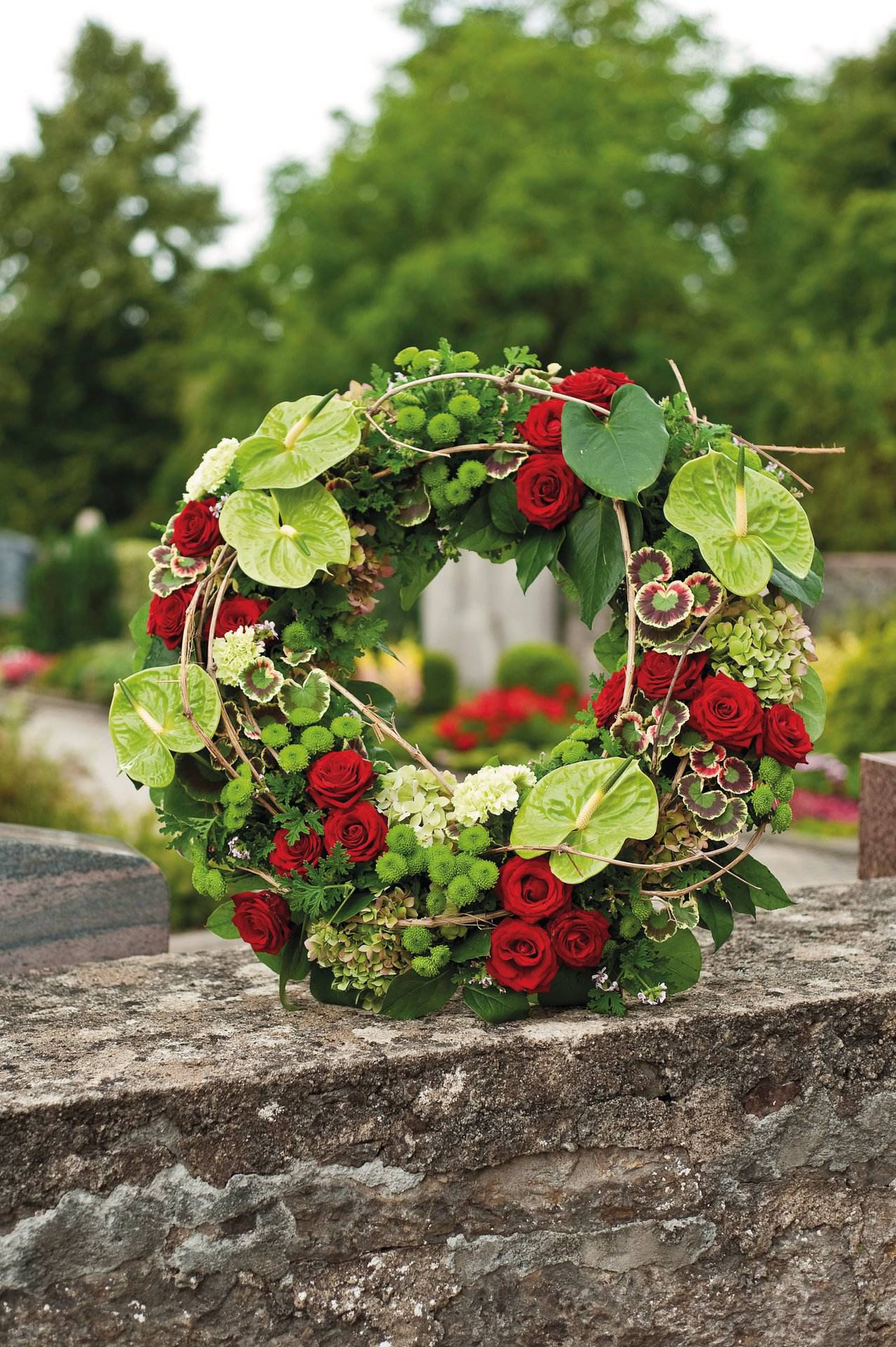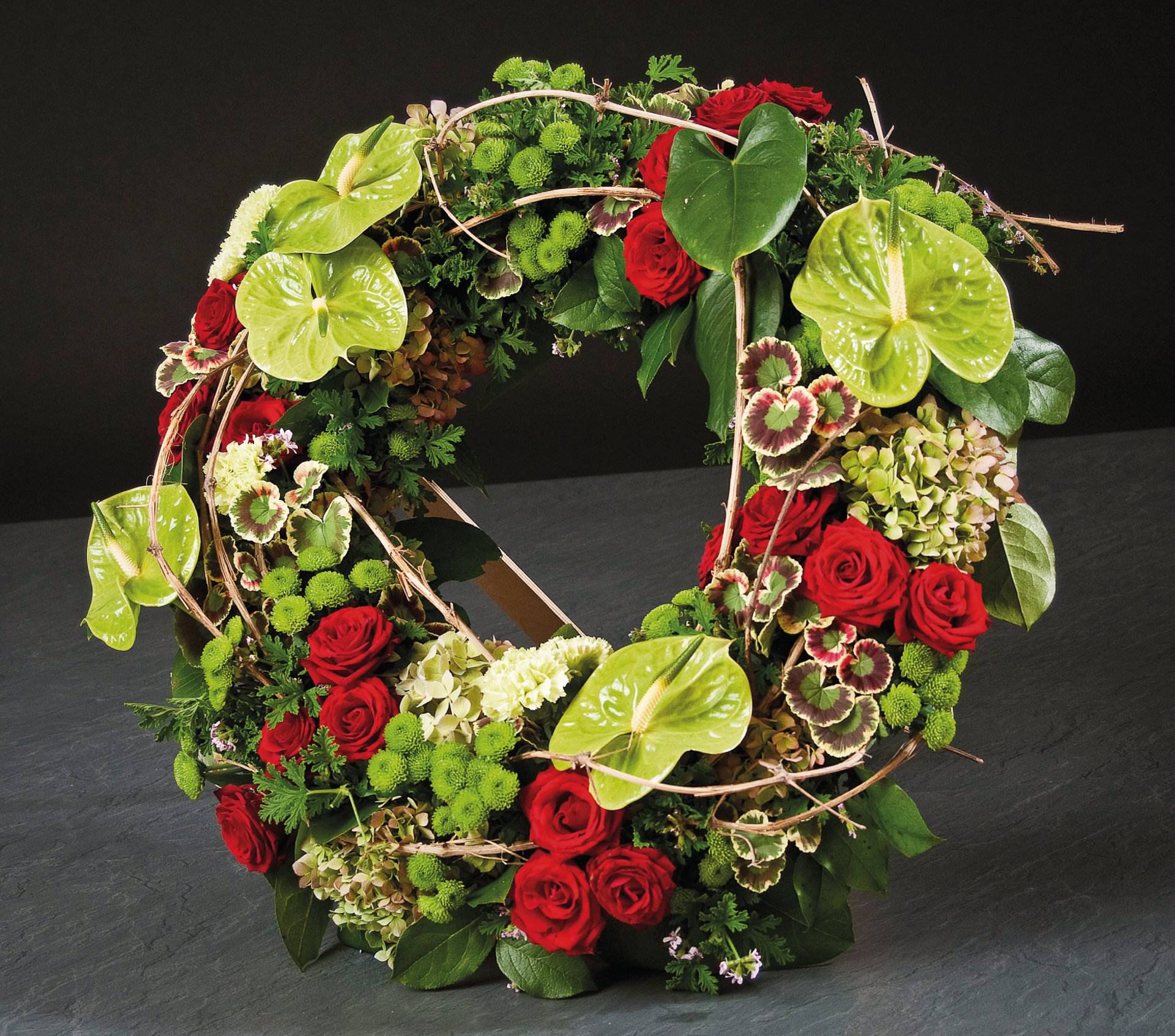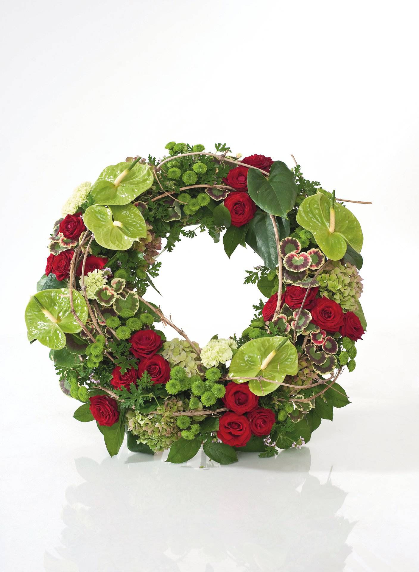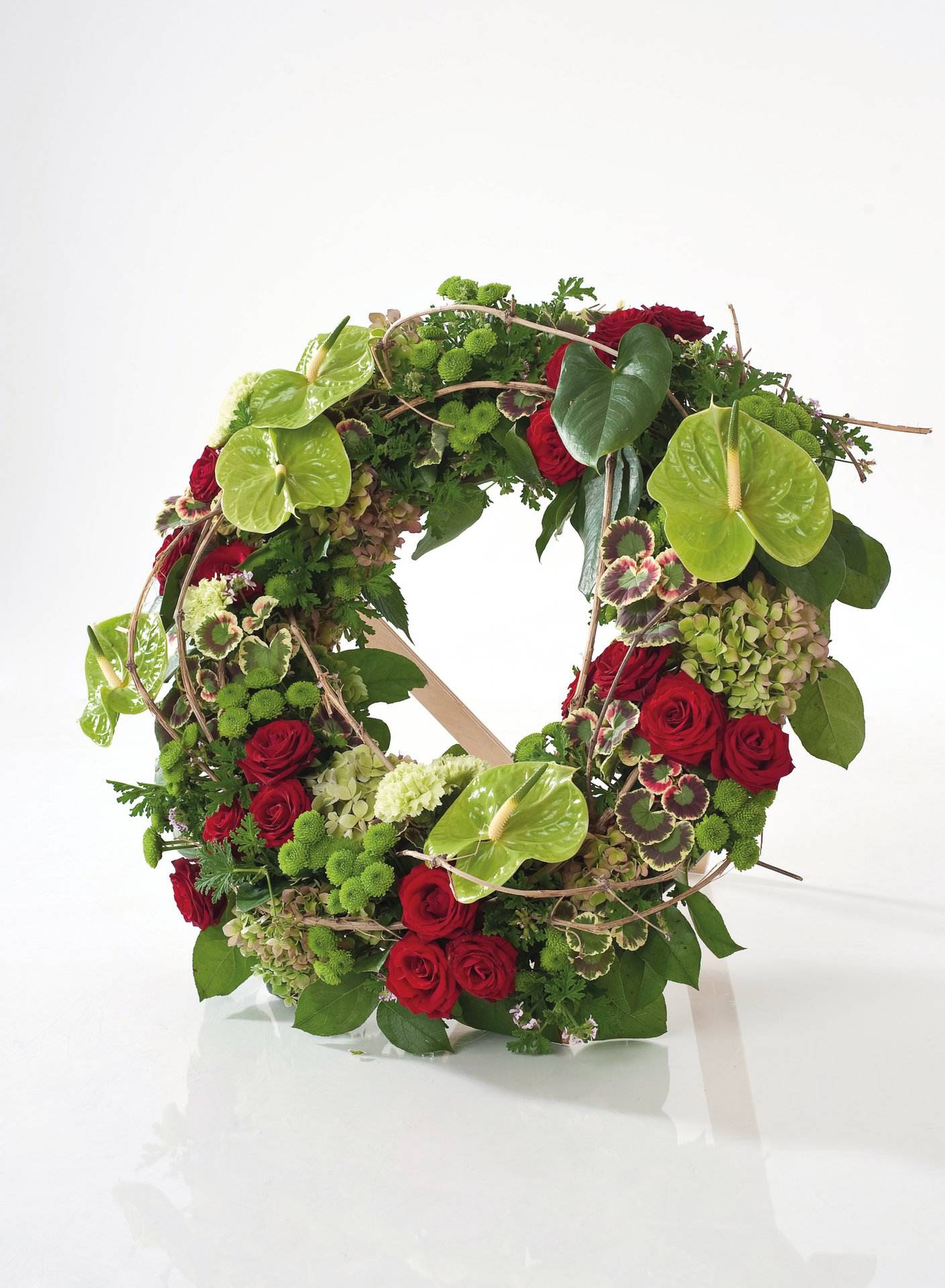 Großer Nass-Steckschaumkranz mit Gitterdrahtmantel und stabiler Holzunterlage, zum Stellen. Innenmaße: N° 116559 Ø 36 cm, N° 116659 Ø 58 cm.