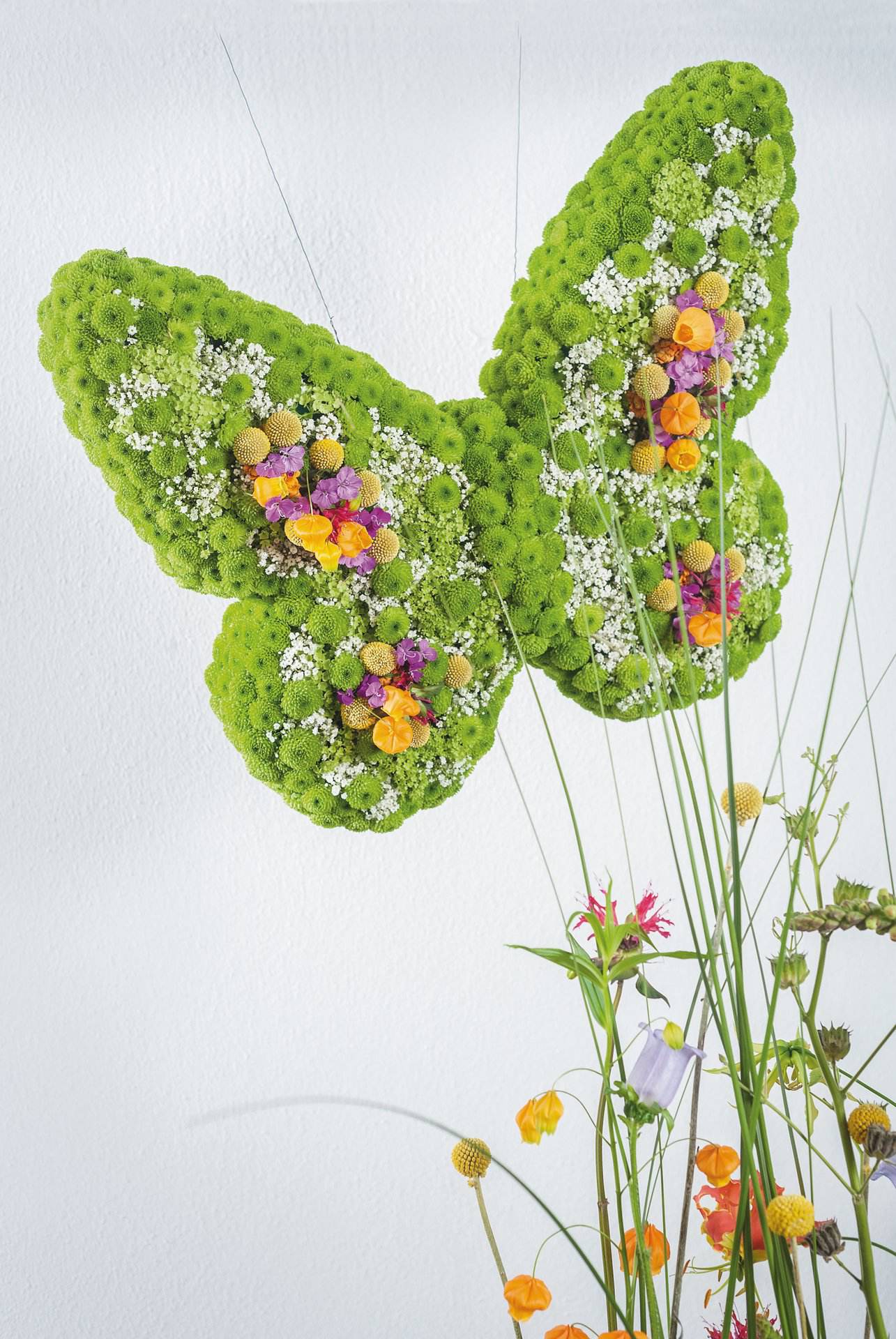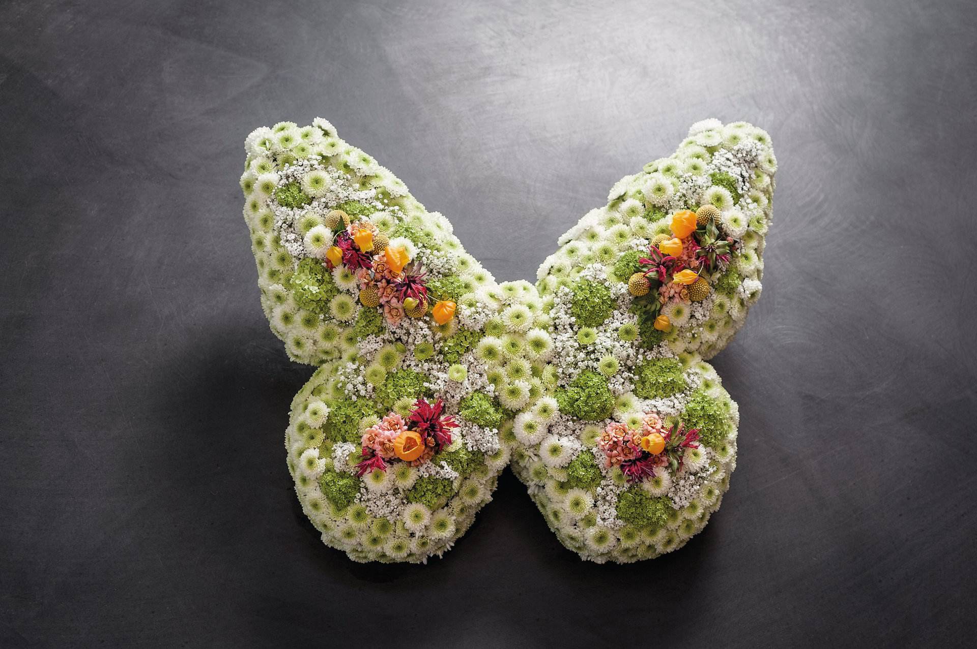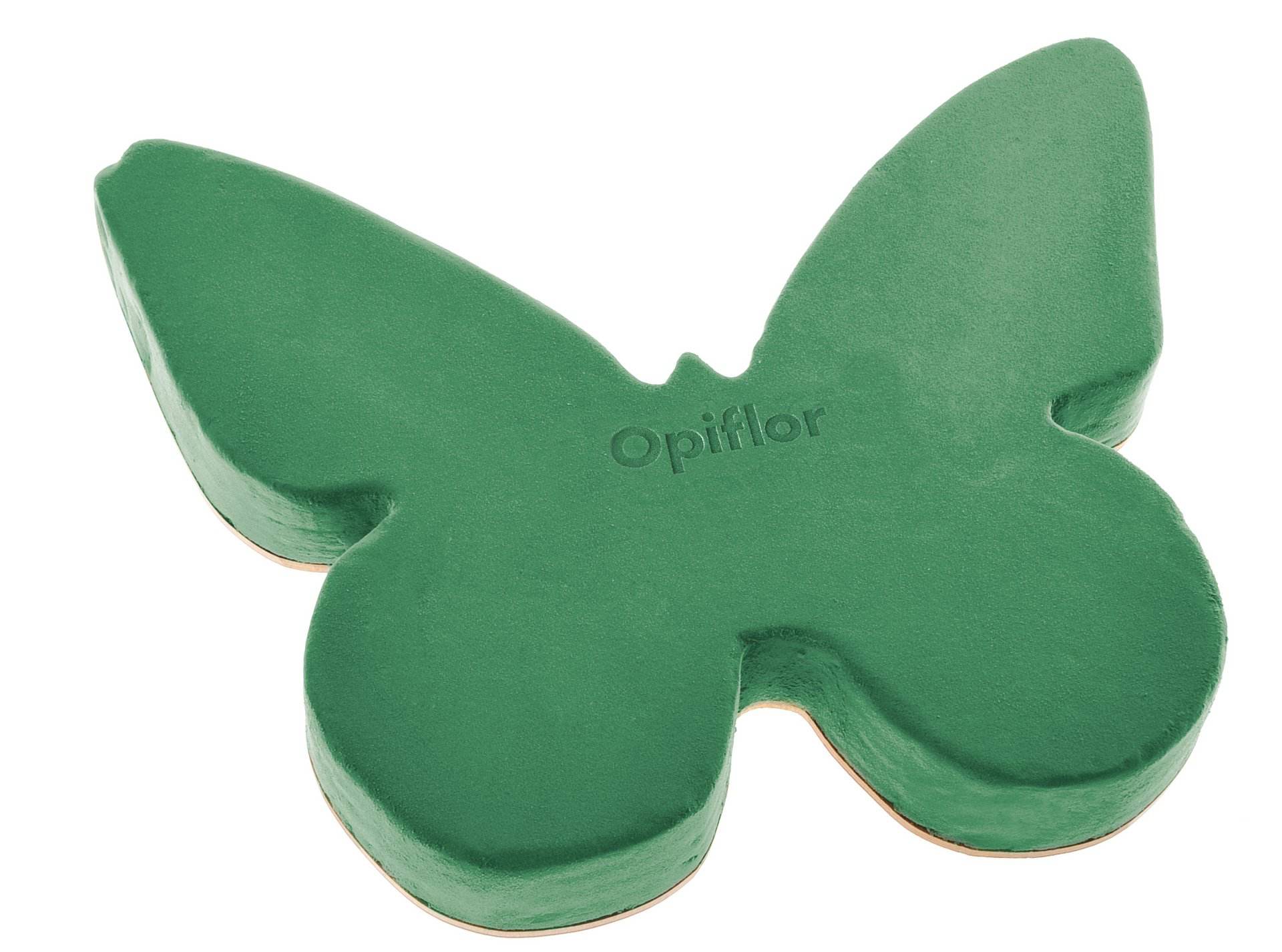 Nass-Steckschaum-Schmetterling auf stabiler, verrottbarer Holzunterlage, zum Legen.