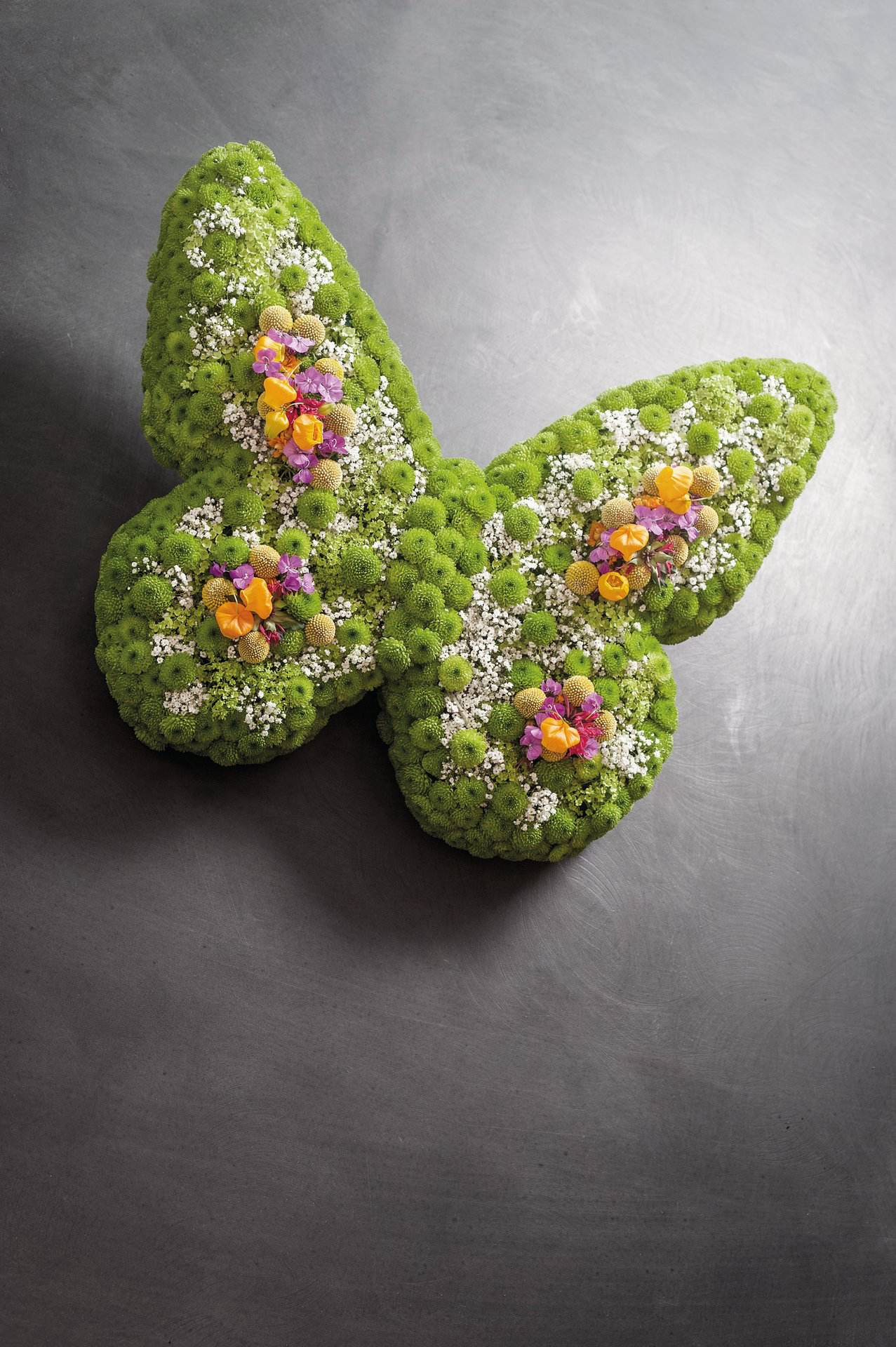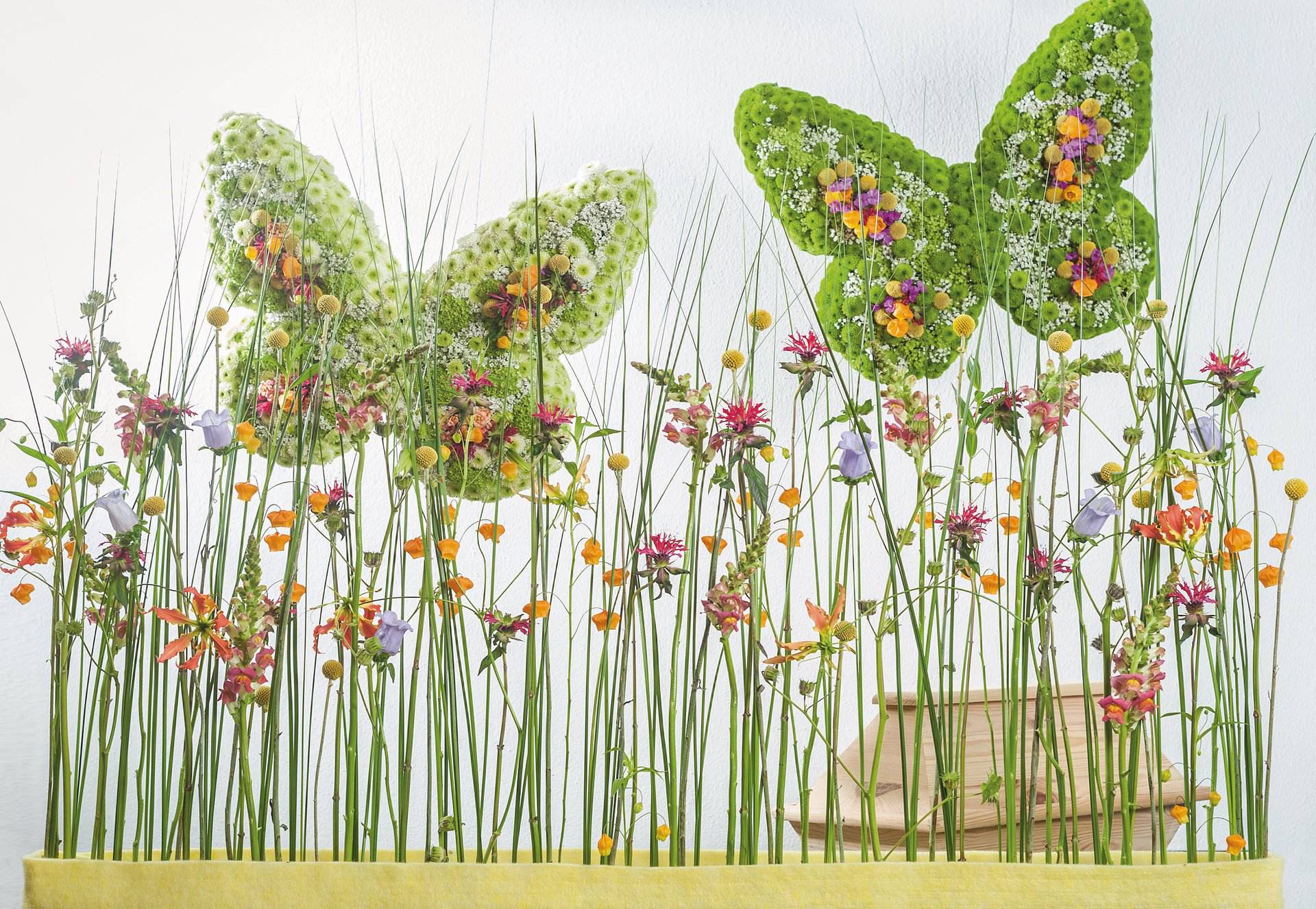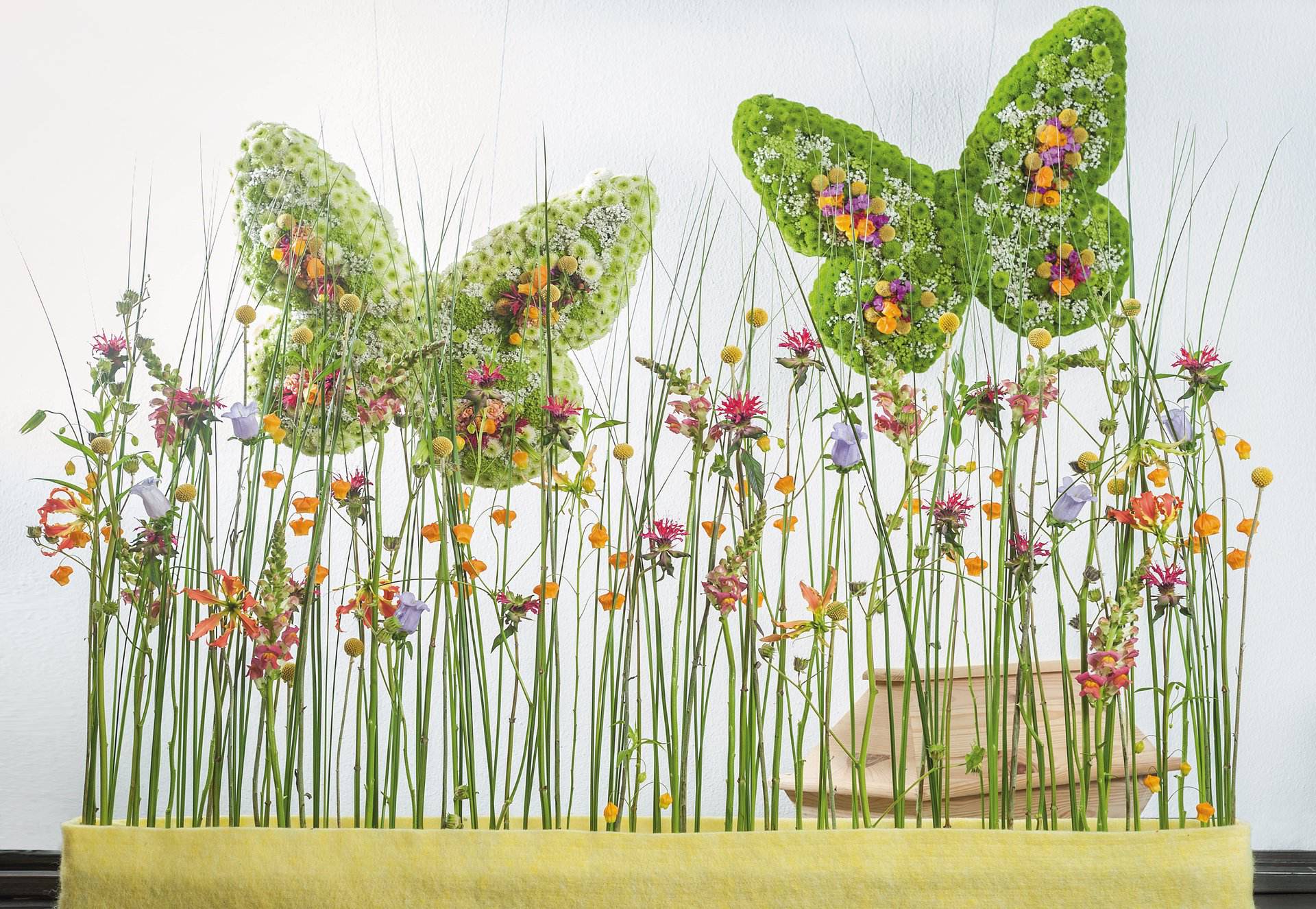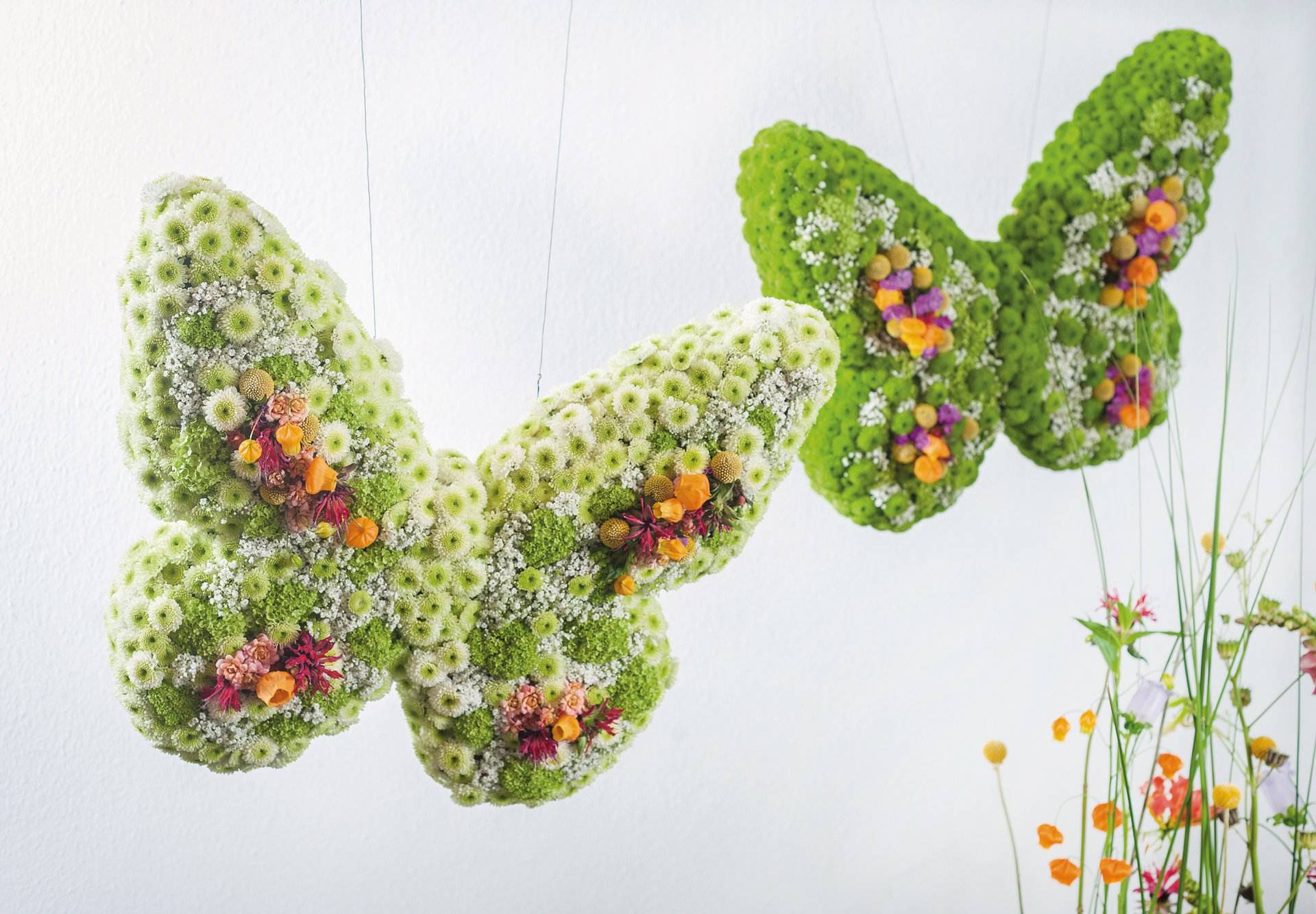 Nass-Steckschaum-Schmetterling auf stabiler, verrottbarer Holzunterlage, zum Legen.