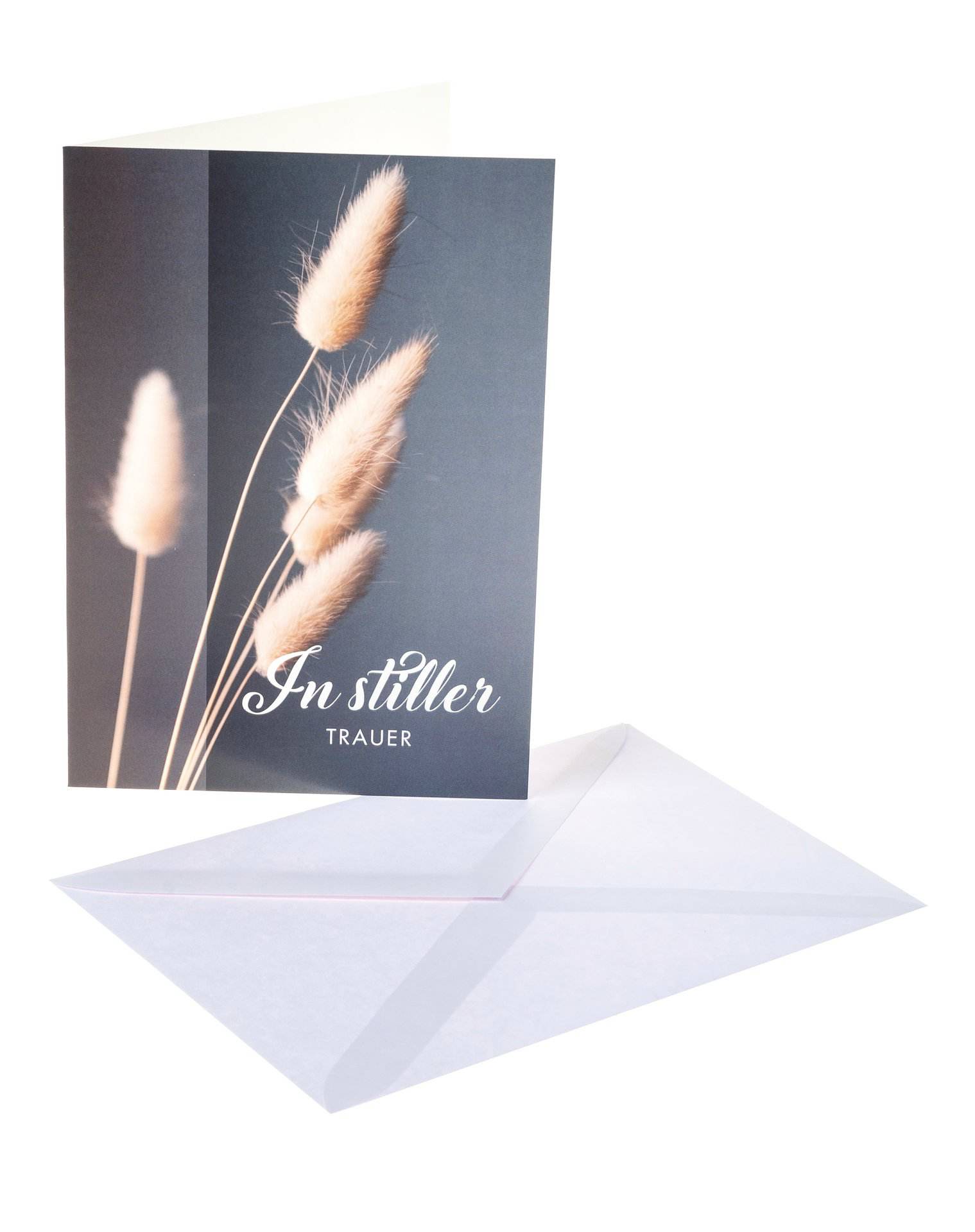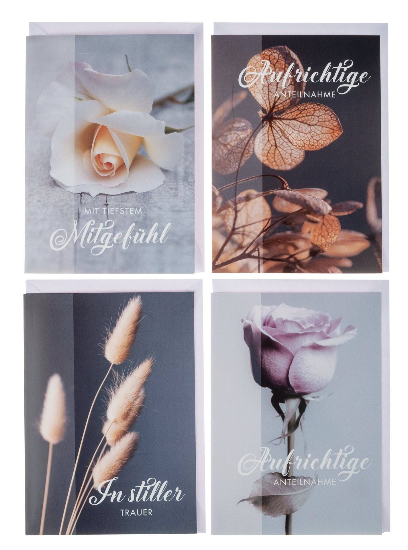 Würdevolle Trauerklappkarten mit weißem Kuvert in geschlossenerCellophanverpackung. 4fach sortiert, je 10 Karten.