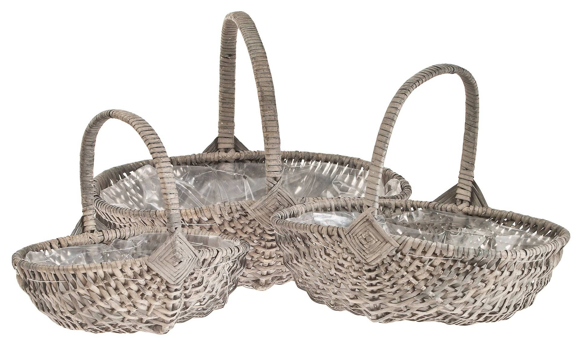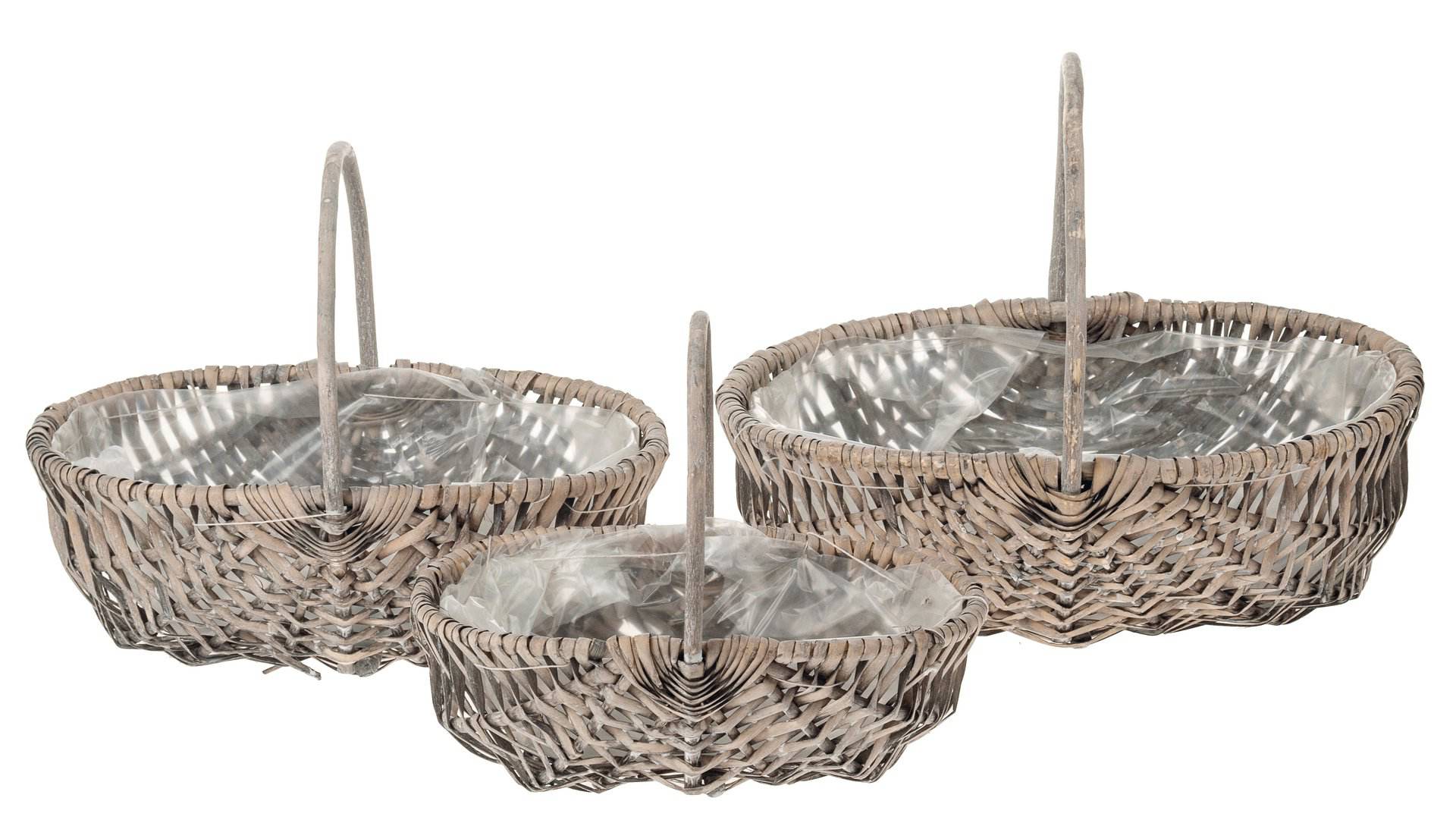 Korb mit Henkel aus grauer, gespaltener Weide in weiß gekalkt. Innen foliert. 3er Set. Größen: 30 x 19 x 11 - 25 cm, 36 x 25 x 14 -30 cm und 41 x 30 x 14 - 33 cm.