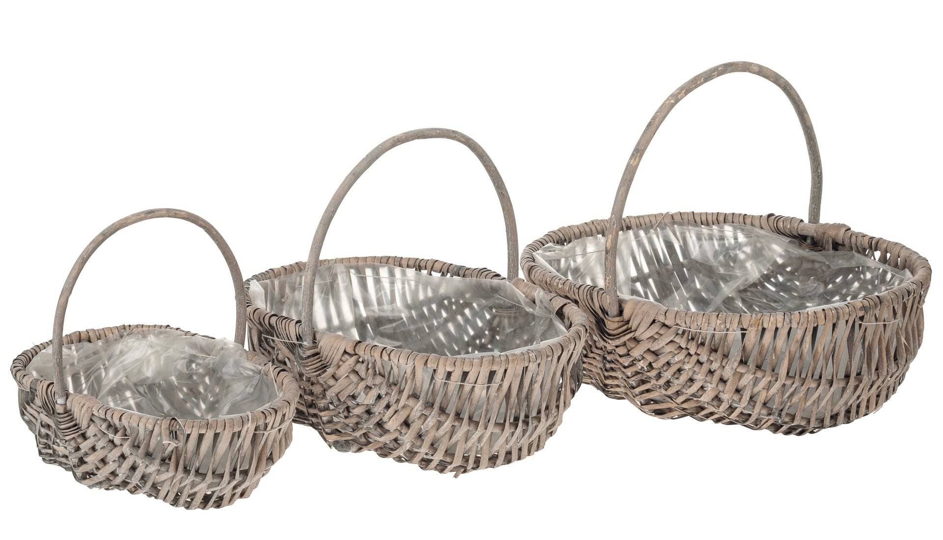 Weidenkorb mit Henkel. Innen foliert. 3er Set.Größen: 25 x 14 x 10 cm, 31 x 19 x 13 cm und 37 x 24 x 16 cm.