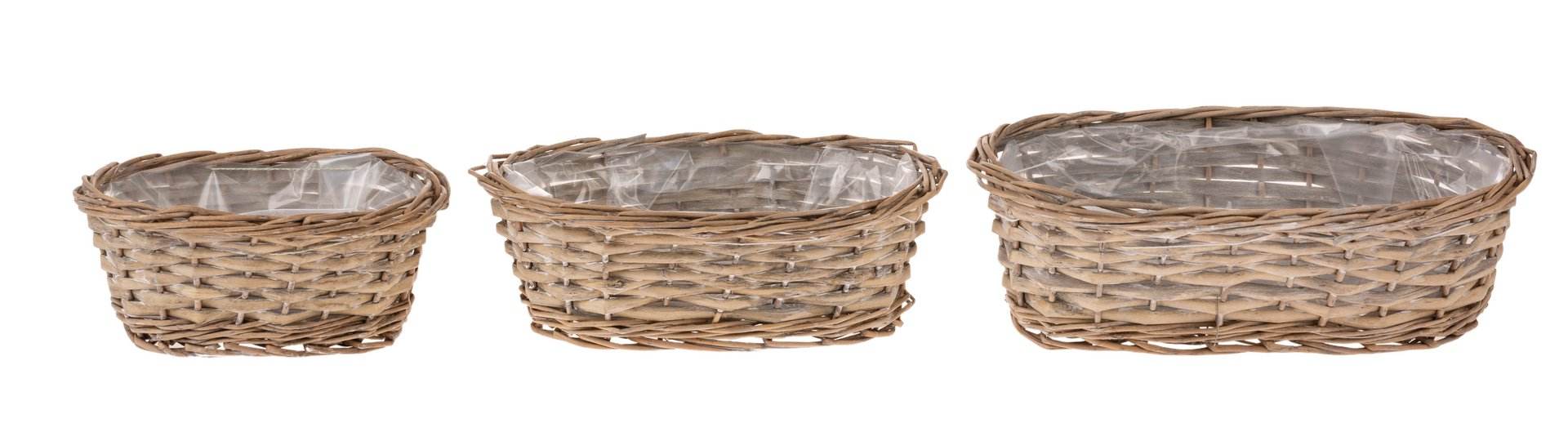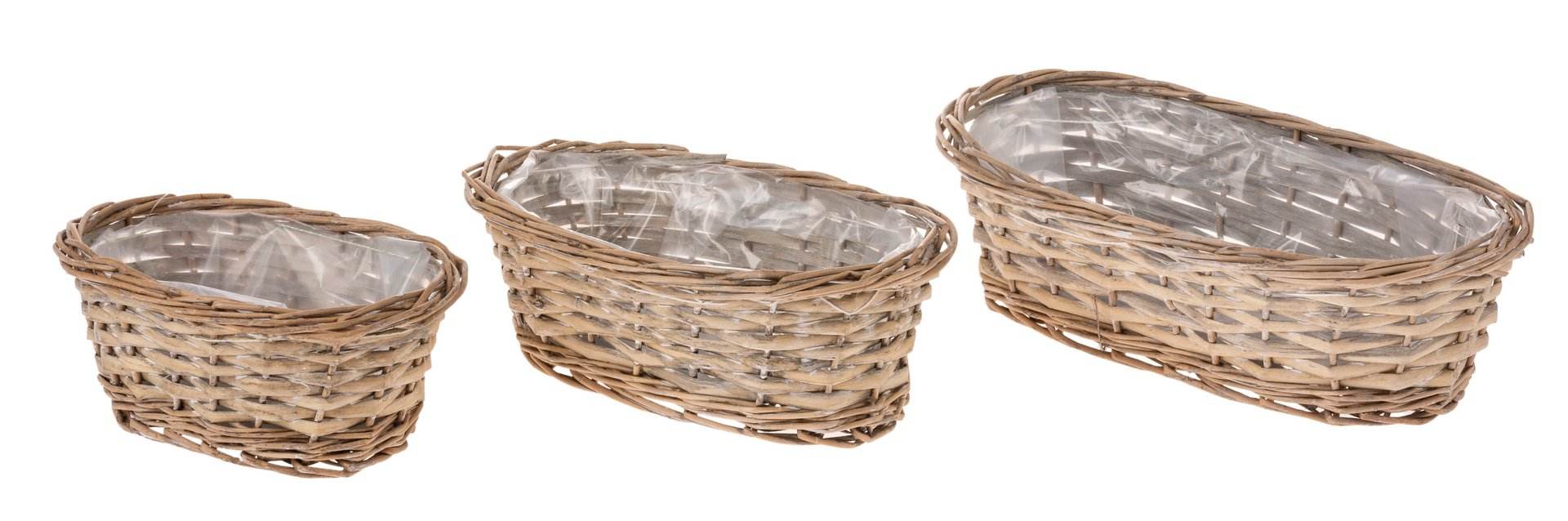 Ovaler Pflanzkorb aus Holzspanstreifen. Innen foliert. 3er Set.Größen: 22 x 14 x 10 cm, 26 x 18 x 11 cm, 30 x 21 x 12 cm.