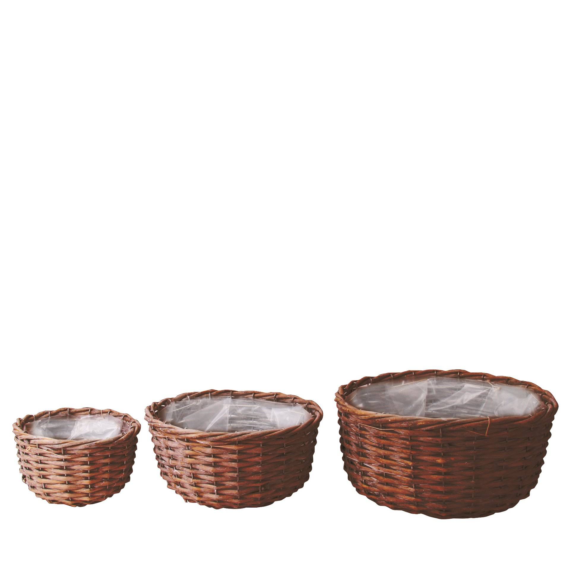 Weidenkorbschale zum Bepflanzen. Innen foliert. 3er Set. Größen: Ø 15 x 8 cm, Ø 22 x 10 cm und Ø 25 x 12 cm.