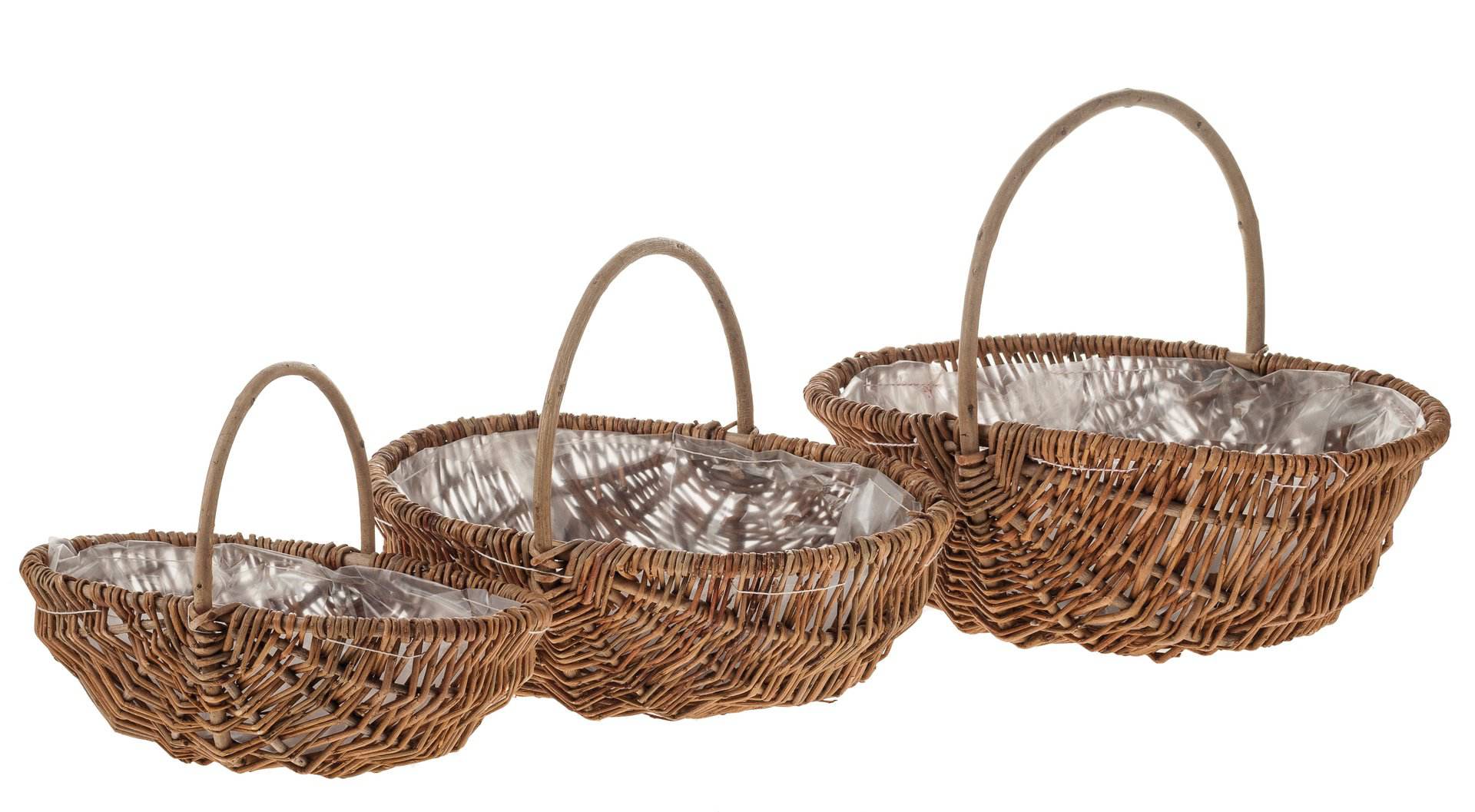 Weidenkorb mit Henkel. Innen foliert. 3er Set.Größen: 25 x 14 x 10 cm, 31 x 19 x 13 cm und 37 x 24 x 16 cm.