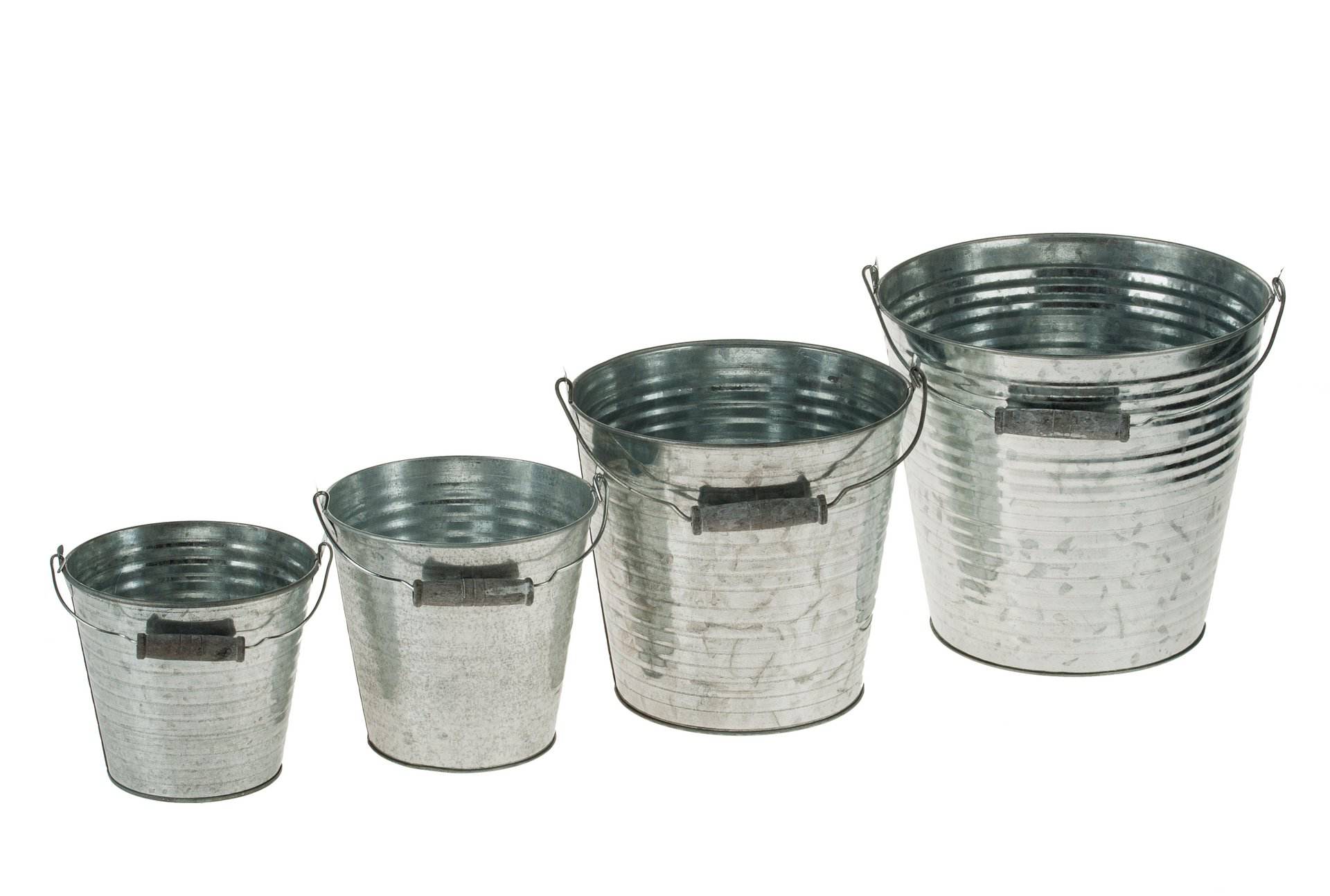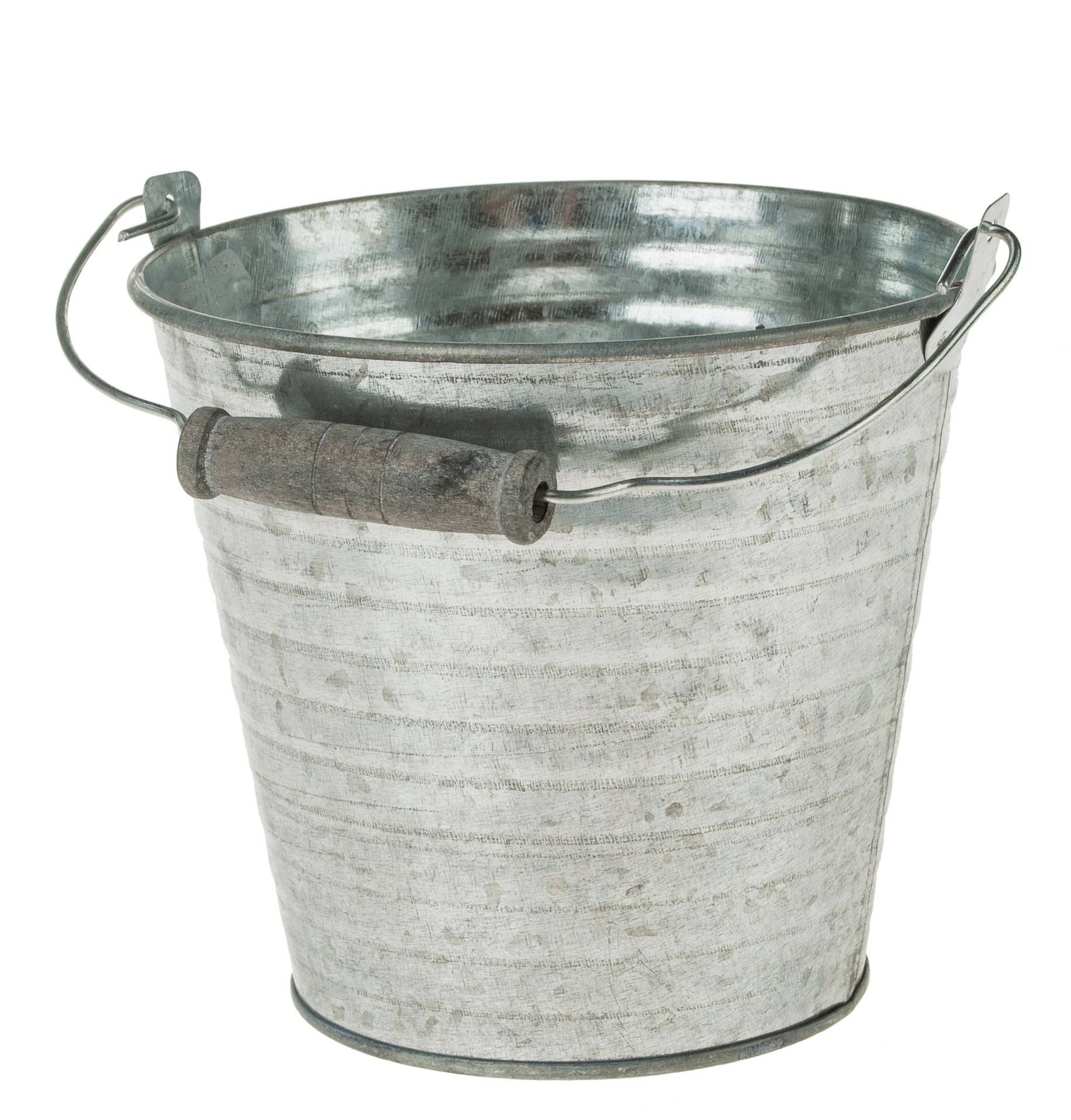 Eimer aus Zink mit Rillen und Henkel mit Holzgriff.