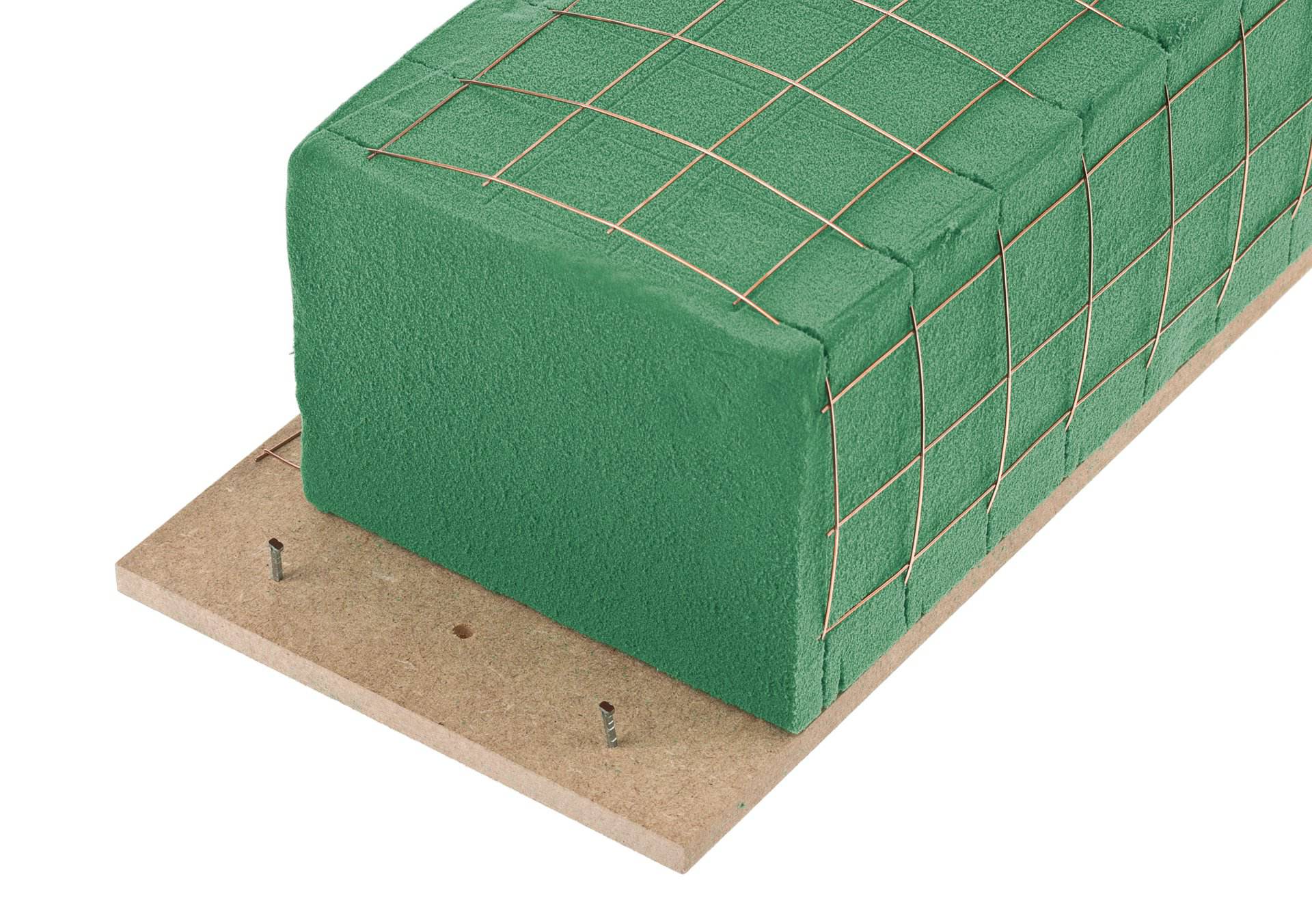 Dessus de cercueil en mousse florale mouillable enveloppée de maillage, sur base en bois avec rebord pour une meilleure manipulation, 4 goupilles pré-posées et 2 trous de vis pré-percés inclus.