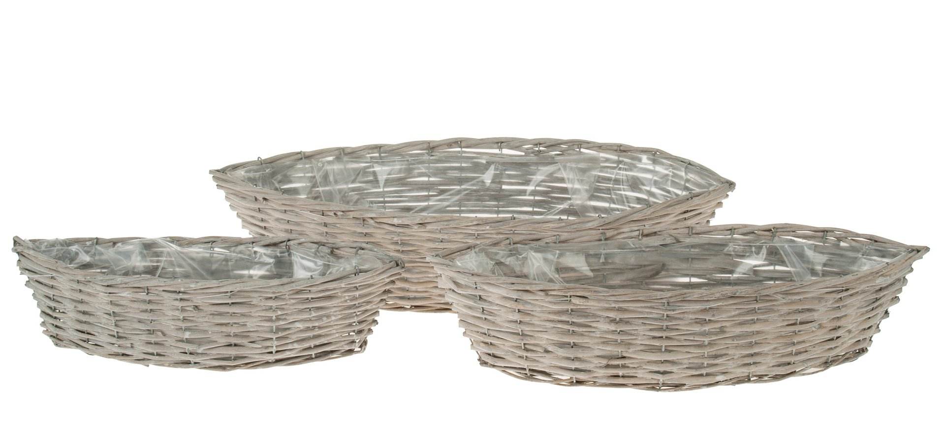 Corbeille ronde en osier gris fendu, blanc chaulé. Intérieur recouvert d'un film protecteur. Set de 3 pièces. Dim. : Ø 15 x 8 cm, Ø 22 x 10 cm, Ø 25 x 12 cm.
